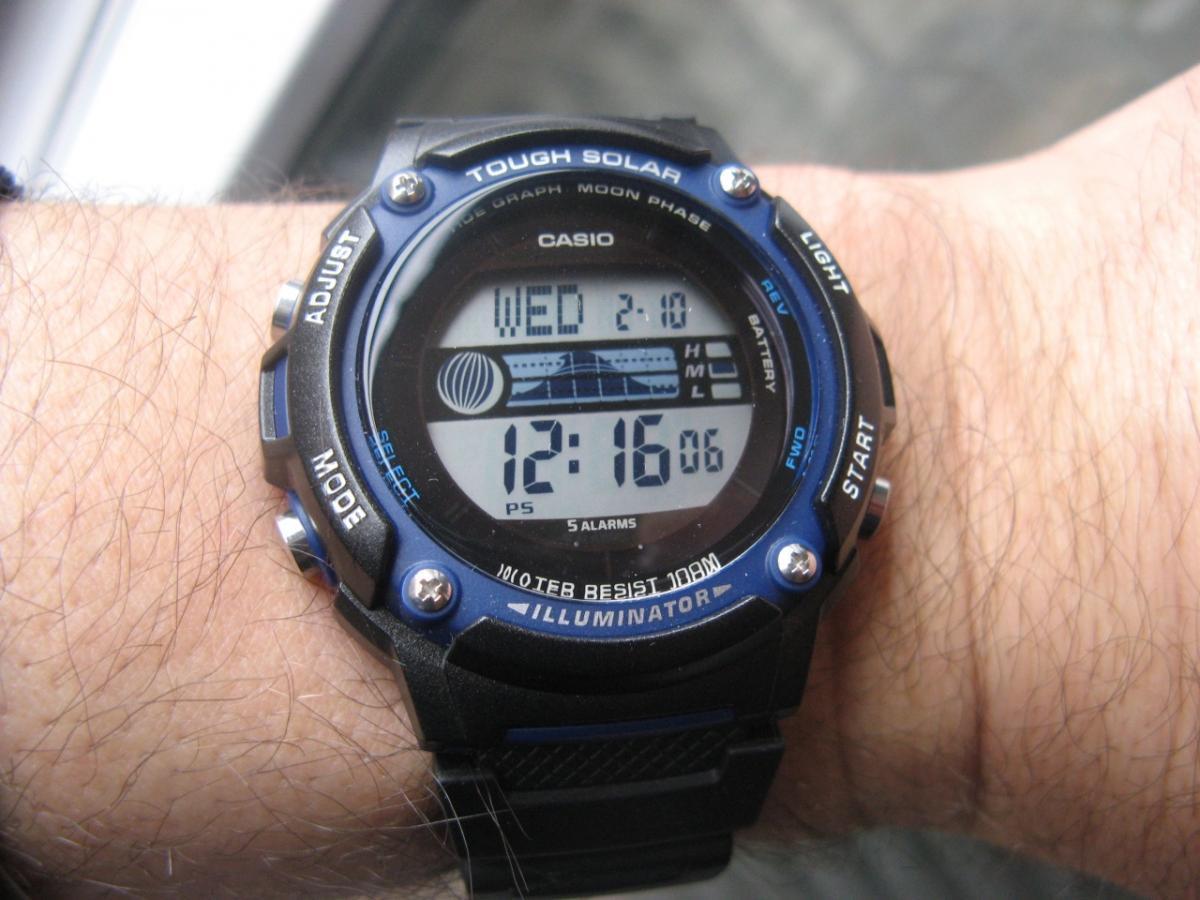 Цифровой способ отображения времени. Светодиодная подсветкаСветодиодная подсветкаСветодиодная или LED-подсветка обеспечивает появление яркого холодного свечения за счёт LED-элементов - маленьких лампочек. Они потребляют минимальное количество энергии, чаще всего можно встретить 1 светодиод, в нижней части циферблата.. Часы работают от солнечной батарейки, которая функционирует от преобразованного в электроэнергию света. Отображается информация о росте и фазе луны, сведения о приливах и отливах.