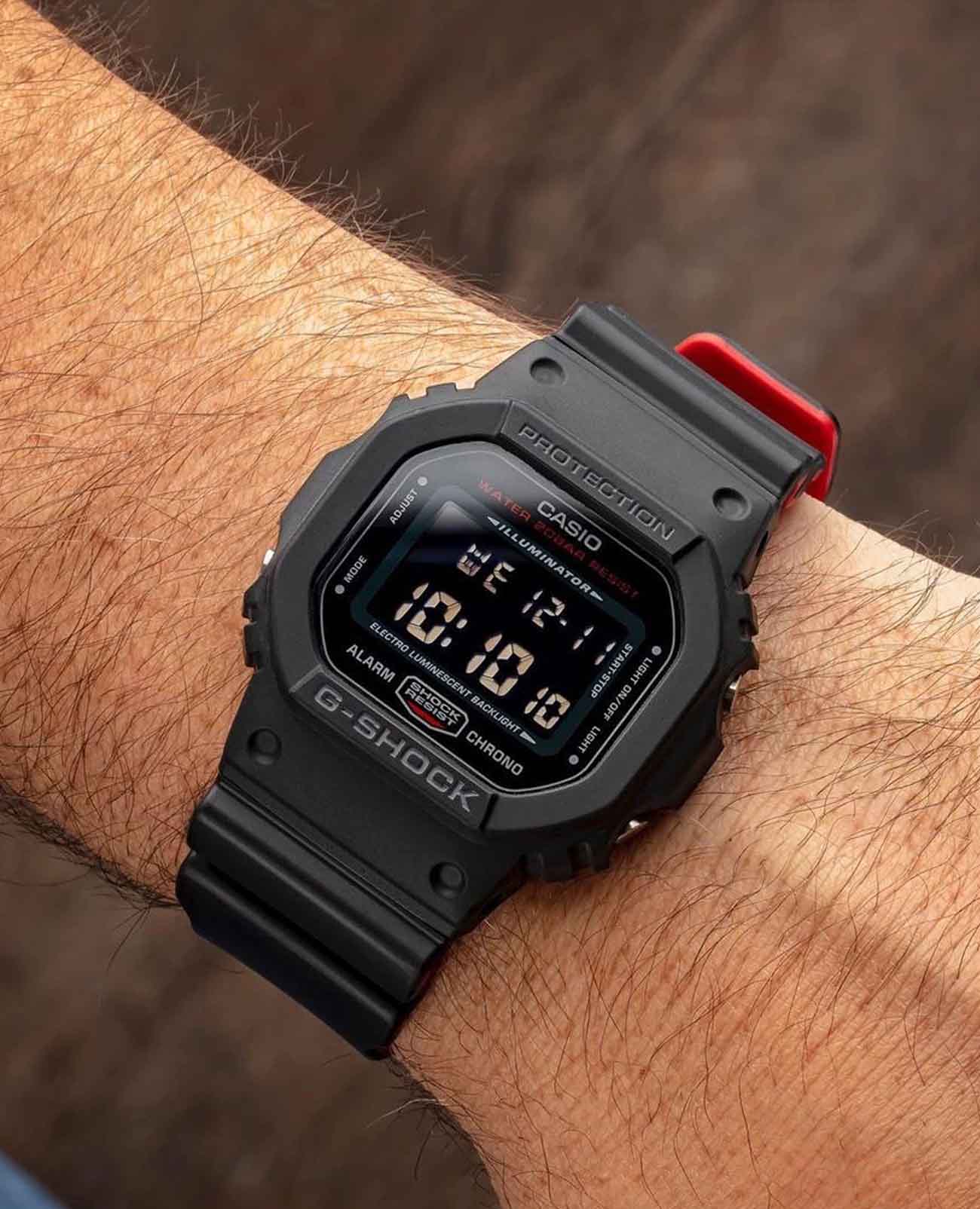 Японские мужские часы-хронографХронографФункция позволяет измерять отрезки времени с особой точностью: часы, минуты, секунды. Верным признаком хронографа является наличие на циферблате 3 дополнительных окошек-счётчиков. Casio G-Shock DW-5600UHR-1DR. Силуэт данного корпуса давно стал классикой и является одним из самых узнаваемых в мире наручных часов. Прекрасный аксессуар на каждый день, который дополнит любой из ваших образов. Корпус изготовлен из полимерного материала. Минеральное стеклоМинеральное стеклоМинеральное стекло представляет собой искусственно выращенный минерал кварца. Такое стекло отличается особой устойчивостью к повреждениям и царапинам. Уступает по некоторым качествам сапфировому стеклу. устойчивое к появлению царапин, обладающее высокой прозрачностью. Светодиодная подсветкаСветодиодная подсветкаСветодиодная или LED-подсветка обеспечивает появление яркого холодного свечения за счёт LED-элементов - маленьких лампочек. Они потребляют минимальное количество энергии, чаще всего можно встретить 1 светодиод, в нижней части циферблата. (Super Illuminator), послесвечение. 12/24-часовой формат. вечный календарьВечный календарьКлассическое часовое усложнение, представляющее собой календарь, рассчитанный на несколько лет вперёд (стандартно – до 2099 года). Определяет текущую дату, день недели, месяц.. СекундомерСекундомерСекундоме́р — прибор, способный измерять интервалы времени с точностью до долей секунды.. ТаймерТаймерОтсчитывает секунды в обратном направлении в заданном интервале времени.. Часовой сигнал времени. Многофункциональный будильник. Оповещение о вспышке мигает с зуммером, который сигнализирует о тревогах, сигналах часового времени, сигнале таймера обратного отсчета времени. Класс водозащиты: 200 метров, позволит плавать, нырять и заниматься другими водными видами спорта. Ремешок из полимерного материала на стандартной застежке.
