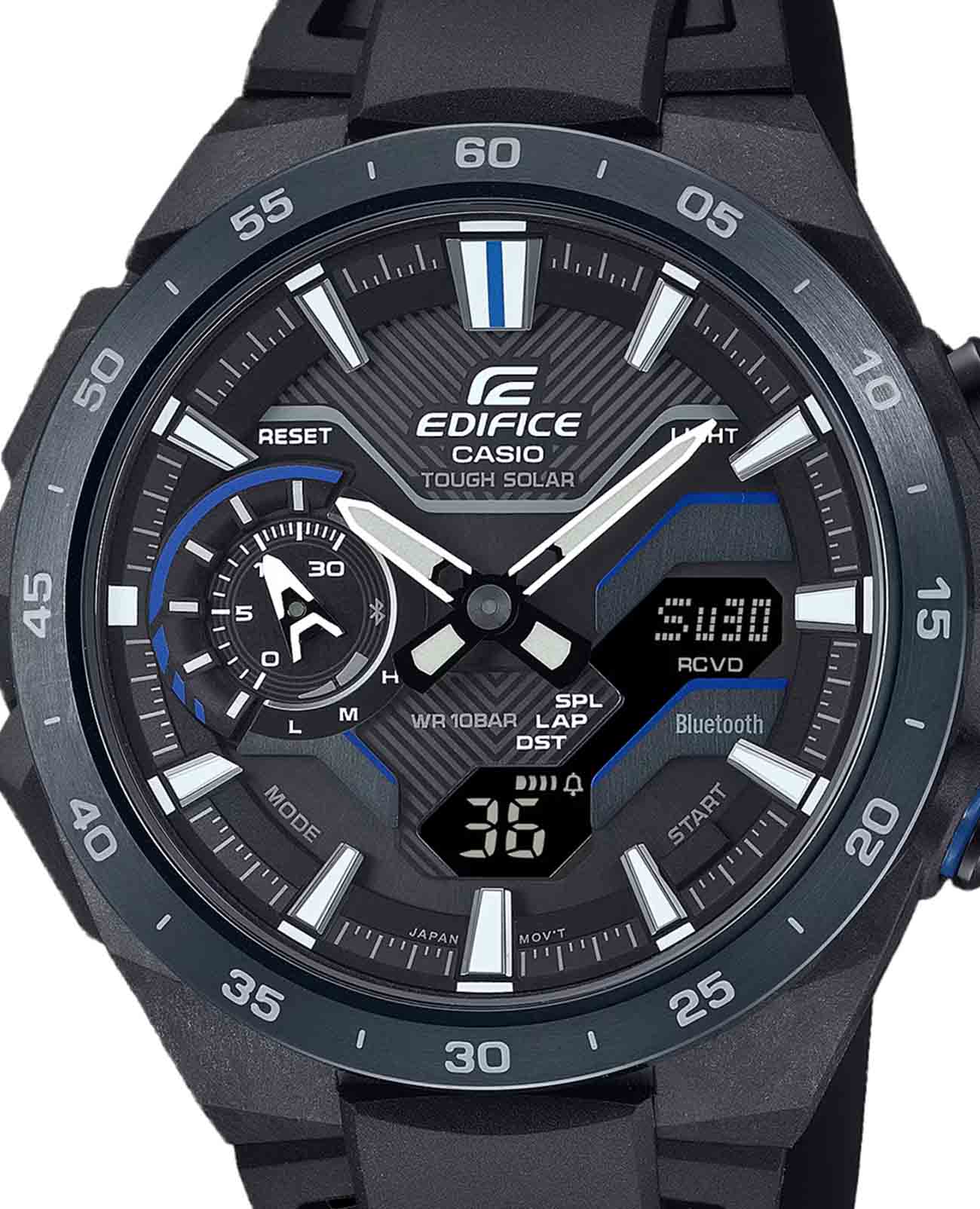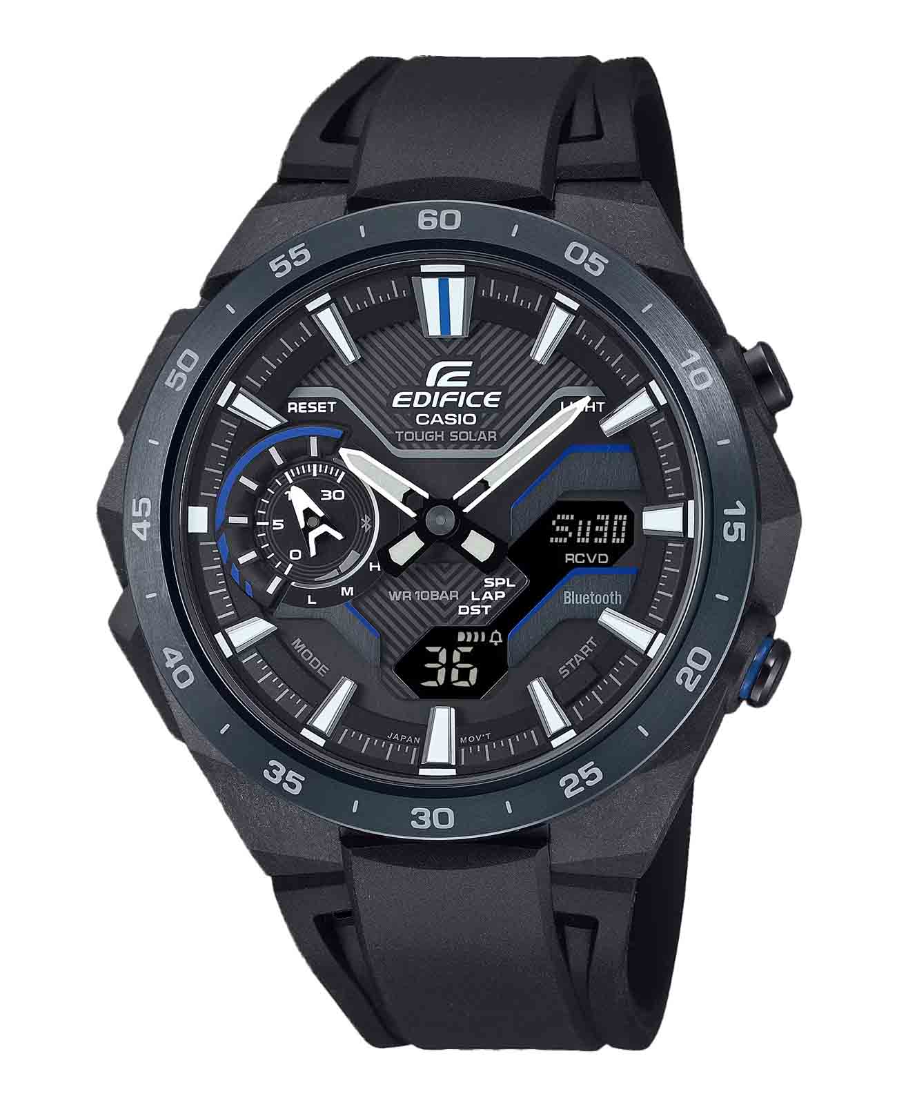 Мужские часы, дизайн которых вдохновлен воздушным потоком вокруг гоночного автомобиля. Многофункциональные японские мужские часы с BluetoothBluetoothСовременная технология, позволяющая синхронизировать часы с телефоном и переносить данные. Часы с Bluetooth расширяют возможности вашего смартфона и делают его использование ещё более удобным. Casio Edifice Windflow ECB-2200PB-1ADF, кварцевый механизм с высокой точностью. Корпус часов изготовлен из карбона со стальной вставкой с IP-покрытиемIP-покрытиеМетод ионного напыления. Демонстрирует повышенную устойчивость к истиранию, окислению и химическим веществам. Под воздействием высокого давления и температуры около 1500°C молекулы металла надёжно соединяются с частицами корпуса часов.. Питание от солнечной энергии Tough SolarTough SolarТехнология основана на подзарядке аккумулятора от источника солнечного света, специальная панель улавливает солнечные лучи и преобразует их в энергию для работы часов. Достаточно пары минут нахождения на солнце для функционирования часов в течении суток. - солнечные батарейки большой мощности, индикатор заряда батареи. Функция автоматического сохранения энергии. Время работы аккумулятора без подзарядки приблизительно 7 месяцев, при включенной функции сохранения энергии приблизительно 18 месяцев. Двойная подcветка: циферблат и ЖК-дисплеи подсвечиваются светодиодомСветодиодная подсветкаСветодиодная или LED-подсветка обеспечивает появление яркого холодного свечения за счёт LED-элементов - маленьких лампочек. Они потребляют минимальное количество энергии, чаще всего можно встретить 1 светодиод, в нижней части циферблата., благодаря наличию функции задержки, после отпускания кнопки освещение горит еще несколько секунд. Настраиваемое послесвечение 1,5 или 3сек. Подсветка NeobriteПодсветка NeobriteИспользование светонакопительных составов на основе сульфида цинка или алюмината стронция, яркий свет можно наблюдать на протяжении 6-10 часов после «зарядки» часов около источника света. обеспечивает длительное послесвечение в темноте даже после кратковременного нахождения на свету. 12-ти и 24-х часовой формат времени. СекундомерСекундомерСекундоме́р — прибор, способный измерять интервалы времени с точностью до долей секунды. с двумя точностями показаний: 1/100с (до 1ч) и 1с (после 1ч) и временем измерения 24ч. Сплит-хронографСплит-хронографИспользуется для измерения продолжительности нескольких временных отрезков, начинающихся одновременно, а заканчивающихся в разное время.. ТаймерТаймерОтсчитывает секунды в обратном направлении в заданном интервале времени. обратного отсчета от 1с до 1ч. Мировое времяМировое время Полезное часовое усложнение, отображающее время в основных городах и известных областях по всему миру, оно связано с часовыми поясами, удобно для путешественников и бизнесменов. – 38 городов (38 часовых поясов), всемирное координированное время (UTCUTCВсемирное кординационное время, не имеющее привязки к географическому положению Гринвича, основывается на атомном отсчёте времени. Регулировка времени осуществляется более точно, чем устаревшее GMT.