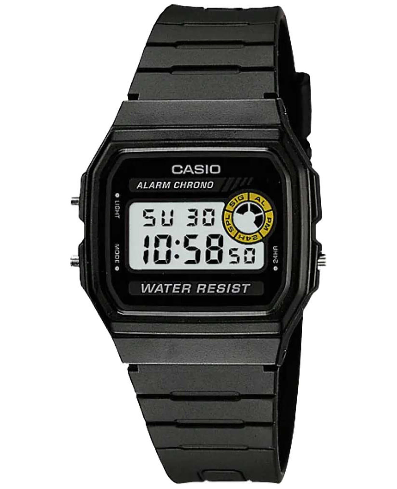 Простые и удобные мужские электронные часы на каждый день в популярном ретро-стиле Casio Collection F-94WA-8D, кварцевый механизм с высокой точностью. Класс водозащиты: 30 метров, позволит защитить корпус от случайных брызг или капель дождя. Корпус часов изготовлен из пластика. Пластиковый ремешок на стандартной застёжке. Циферблат подсвечивается сбоку электролюминесцентная подсветкойЭлектролюминесцентная подсветкаЭлектролюминесцентная панель устанавливается под ЖК-экраном часов, при нажатии кнопки электричество преобразуется в свет за счёт подачи напряжения на атомы фосфора, такой тип подсветки позволяет освещать весь циферблат.. СекундомерСекундомерСекундоме́р — прибор, способный измерять интервалы времени с точностью до долей секунды. с точностью показаний 1/100с и временем измерения 1ч. 12-ти и 24-х часовой формат времени.