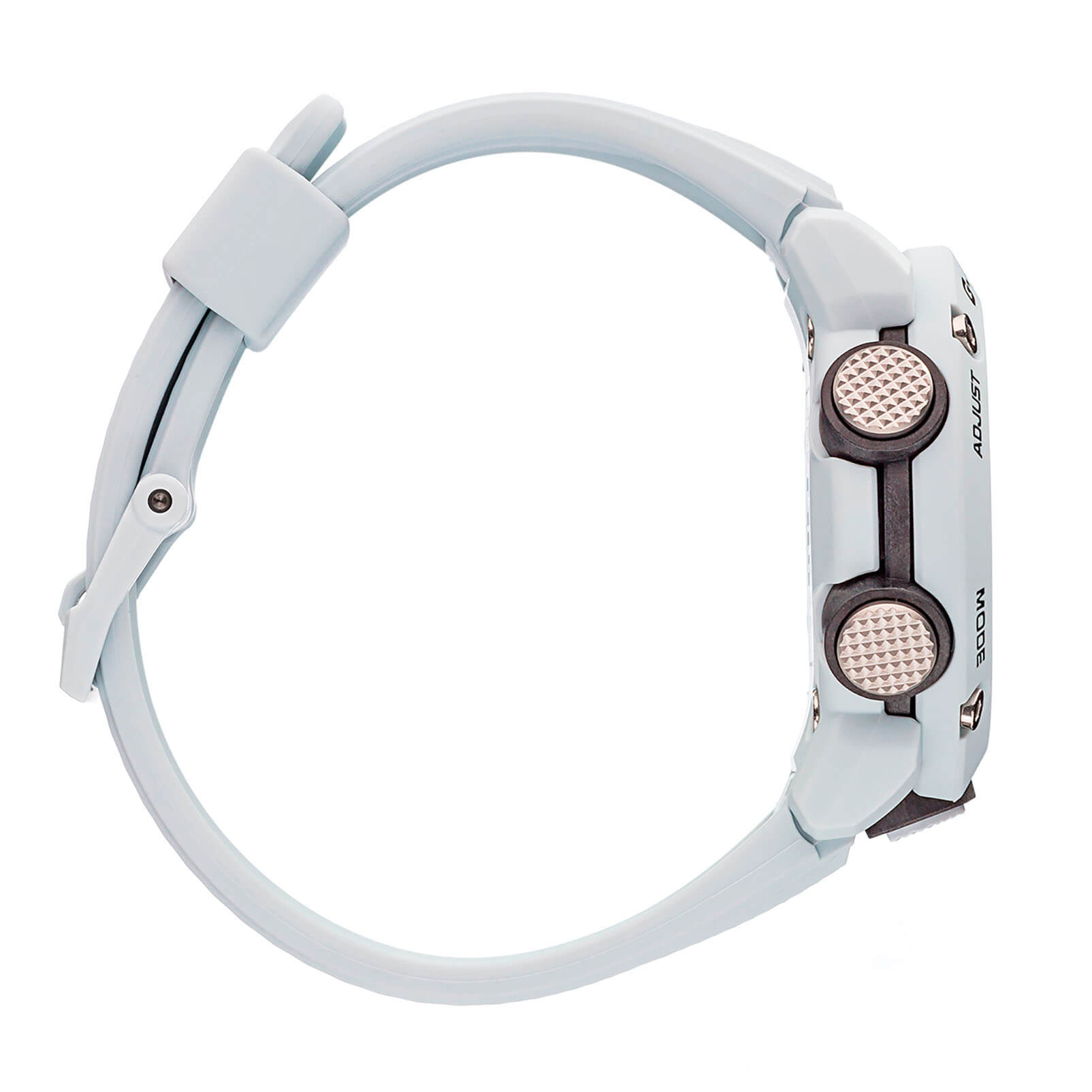 Наручные часы в белоснежном исполнении реализуют технологию Carbon Core GuardCarbon Core Guard Новейшая структура корпуса, разработанная Casio. Полиуретановая пластина дополнительно усилена карбоновыми вставками, что придаёт специальную защиту от механических повреждений. Карбон отличается лёгкостью и прочностью., карбон послужил материалом для изготовления противоударного корпусаУдаропрочный корпусМеханизм заключён в корпус, выполненный из современных материалов, устойчивых к ударам, механическим повреждениям и падению с высоты: инновационный пластик, карбон, нержавеющая сталь, титан.. Это позволило добиться повышенной устойчивости к ударам и падению без утяжеления общей конструкции. БезельБезельВнешний ободок, закрепляющий стекло. В спортивных часах так называется поворотное кольцо с делениями на циферблате, выполняет роль таймера – замеряет отрезки времени на шкале. Неподвижный безель – элемент декора. Однонаправленно вращающийся безель на дайверских часах позволяет фиксировать моменты погружения и выныривания на поверхность. оставлен полимерным. Японский кварцевый механизм работает за счёт батарейки, срок службы которой - 3 года. Закаленное минеральное стекло. Двойная задняя крышка, стальная и пластиковая. Светодиодная подсветкаСветодиодная подсветкаСветодиодная или LED-подсветка обеспечивает появление яркого холодного свечения за счёт LED-элементов - маленьких лампочек. Они потребляют минимальное количество энергии, чаще всего можно встретить 1 светодиод, в нижней части циферблата.. Водонепроницаемость 200 метров. Возможность быстрой и лёгкой замены полимерного ремешка. ХронографХронографФункция позволяет измерять отрезки времени с особой точностью: часы, минуты, секунды. Верным признаком хронографа является наличие на циферблате 3 дополнительных окошек-счётчиков., автоматический календарь, мировое времяМировое время Полезное часовое усложнение, отображающее время в основных городах и известных областях по всему миру, оно связано с часовыми поясами, удобно для путешественников и бизнесменов. , будильник, секундомер, таймер с автоповтором. Габариты: 48,7 x 51,2 x 14,1 мм.