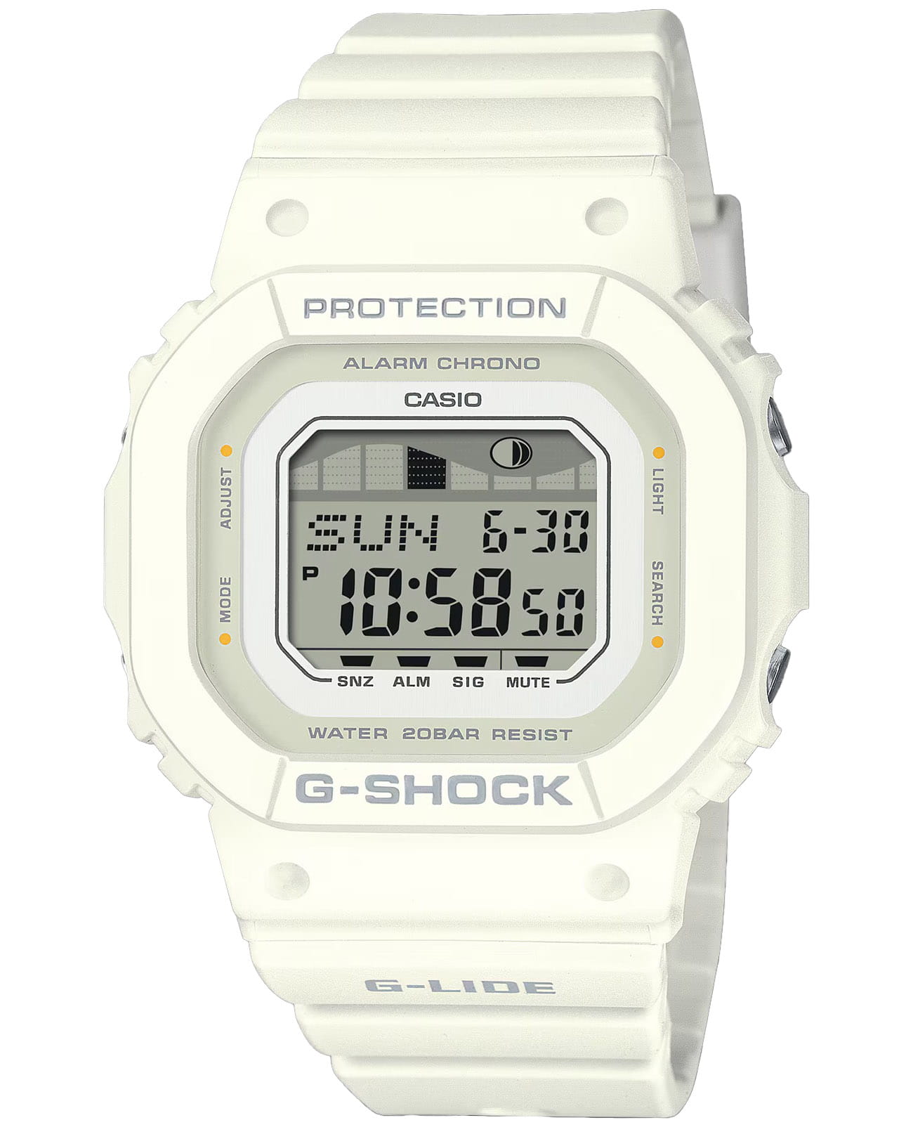 Женские часы-хронографХронографФункция позволяет измерять отрезки времени с особой точностью: часы, минуты, секунды. Верным признаком хронографа является наличие на циферблате 3 дополнительных окошек-счётчиков. Casio G-Shock GLX-S5600-7B из коллекции G-Shock. Винтажная модель в новой цветовой гамме корпуса и ремешка понравится поклонникам серфинга. G-Lide. Модель часов создана на базе GLX-5600. Минеральное стеклоМинеральное стеклоМинеральное стекло представляет собой искусственно выращенный минерал кварца. Такое стекло отличается особой устойчивостью к повреждениям и царапинам. Уступает по некоторым качествам сапфировому стеклу. устойчивое к появлению царапин, обладающее высокой прозрачностью. Ударопрочный корпусУдаропрочный корпусМеханизм заключён в корпус, выполненный из современных материалов, устойчивых к ударам, механическим повреждениям и падению с высоты: инновационный пластик, карбон, нержавеющая сталь, титан. защищает механизм от ударов и вибрации. Электролюминесцентная подсветкаЭлектролюминесцентная подсветкаЭлектролюминесцентная панель устанавливается под ЖК-экраном часов, при нажатии кнопки электричество преобразуется в свет за счёт подачи напряжения на атомы фосфора, такой тип подсветки позволяет освещать весь циферблат. освещает весь циферблат. Мировое времяМировое время Полезное часовое усложнение, отображающее время в основных городах и известных областях по всему миру, оно связано с часовыми поясами, удобно для путешественников и бизнесменов. – 48 городов (29 часовых поясов). СекундомерСекундомерСекундоме́р — прибор, способный измерять интервалы времени с точностью до долей секунды. с точностью измерения 1/100 секунды и измерением до 23 часов 59 минут 59,99 cек. ТаймерТаймерОтсчитывает секунды в обратном направлении в заданном интервале времени. обратного отсчета (диапазон времени 24 часа), автоматический календарь, 12/24 отображение времени. 3 будильникаБудильникБуди́льник — часы, в заданный момент времени подающие звуковой, световой и/или в редких случаях другой сигнал., один с функцией Snooze, ежечасный сигнал. Отображение возраста и фазы Луны. Графическое отображение сведений о приливах и отливах на заданную дату и время. Класс водозащиты: 200 метров, позволит плавать, нырять и заниматься другими водными видами спорта. Ремешок из полимерного материала на стандартной застежке.