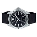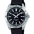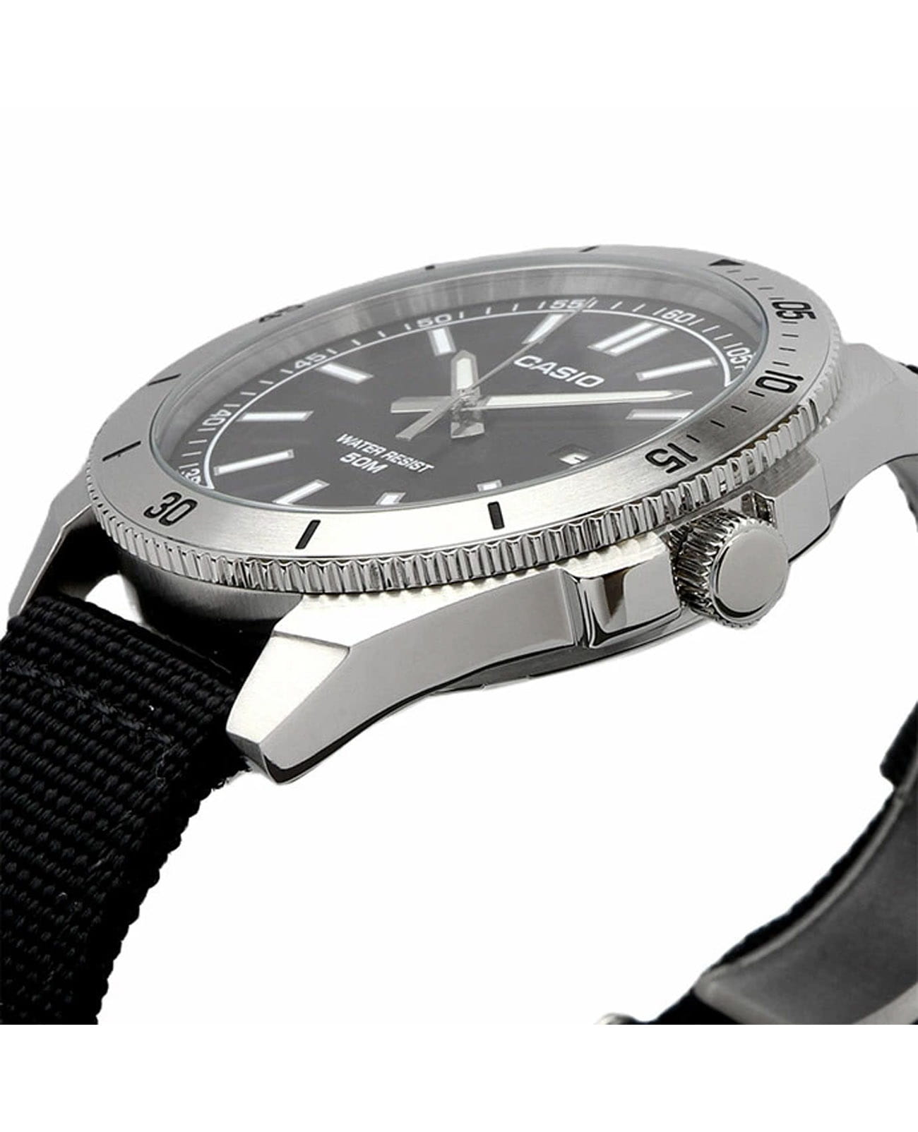 Спортивные японские мужские часы Casio Collection MTP-B155C-1EV с минеральным стекломМинеральное стеклоМинеральное стекло представляет собой искусственно выращенный минерал кварца. Такое стекло отличается особой устойчивостью к повреждениям и царапинам. Уступает по некоторым качествам сапфировому стеклу., устойчивым к мелким механическим повреждениям. Корпус часов изготовлен из нержавеющей стали. Вращающийся стальной безельБезельВнешний ободок, закрепляющий стекло. В спортивных часах так называется поворотное кольцо с делениями на циферблате, выполняет роль таймера – замеряет отрезки времени на шкале. Неподвижный безель – элемент декора. Однонаправленно вращающийся безель на дайверских часах позволяет фиксировать моменты погружения и выныривания на поверхность.. Стрелки и метки с люминесцентным покрытиемЛюминесцентное покрытиеПозволяет считывать показания времени в темноте. Производители наносят на стрелки, часовые индексы, безель или поверхность циферблата светонакопительный состав, дающий холодное свечение.. Задняя крышка с винтовым фиксатором. Батарейка рассчитана на 3 года. Окошко даты в положении 3 часа. Класс водозащиты: 50 метров, позволит защитить корпус от случайных брызг или капель дождя. Тканевый ремешок на стандартной застежке.