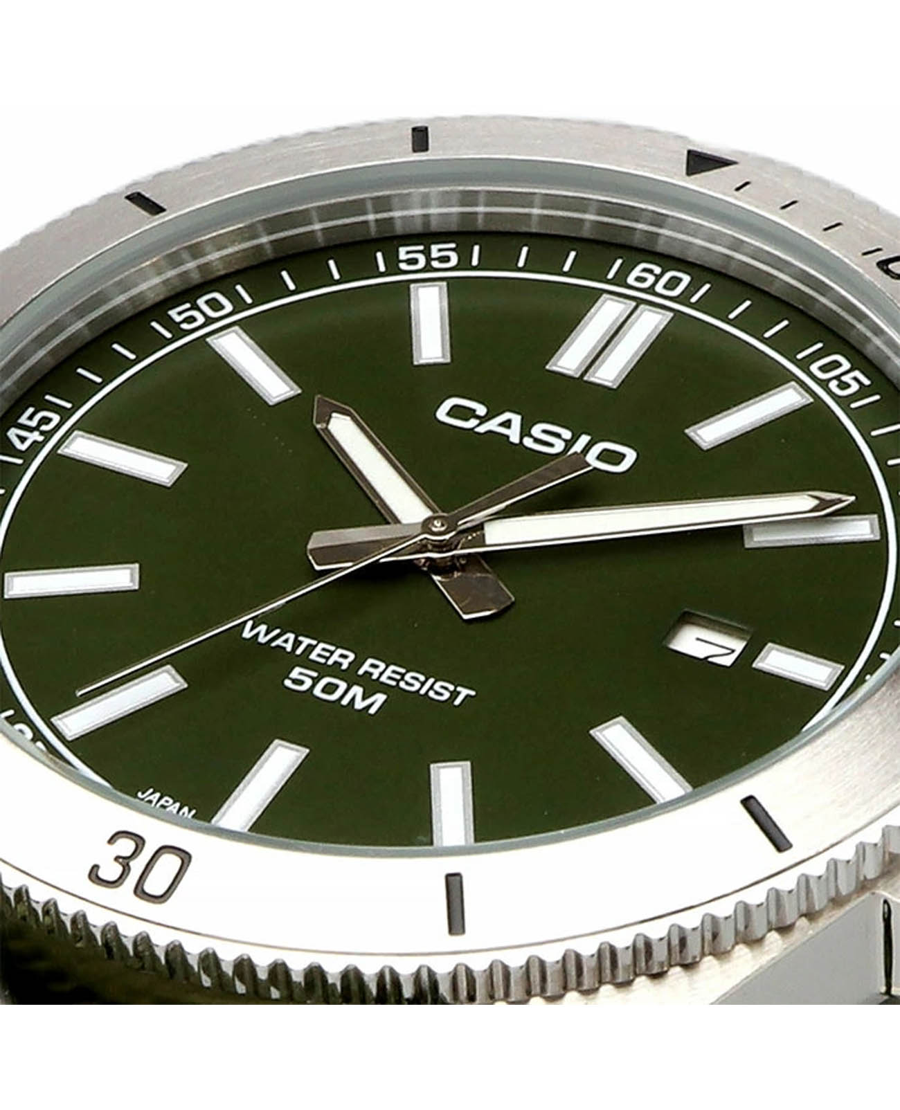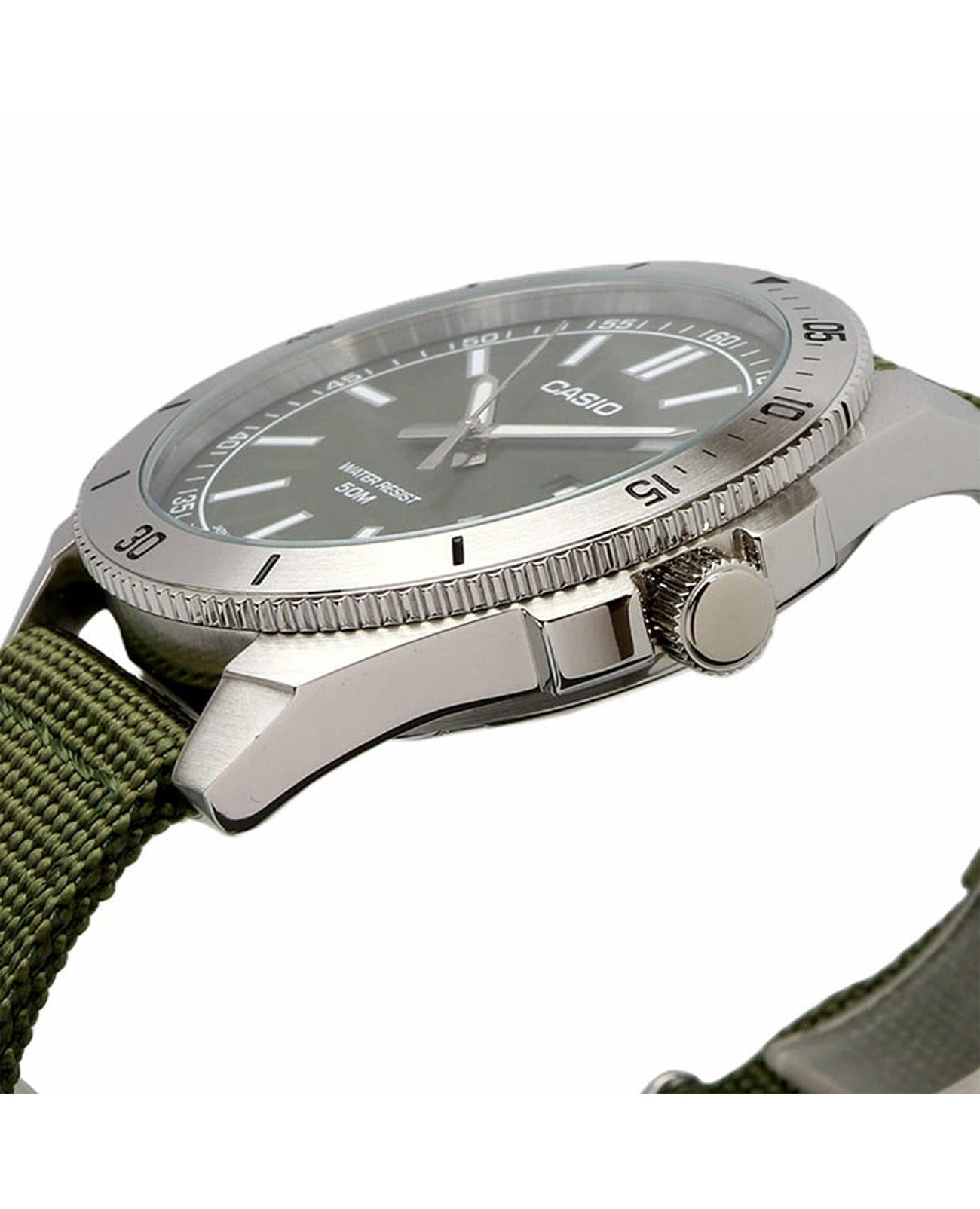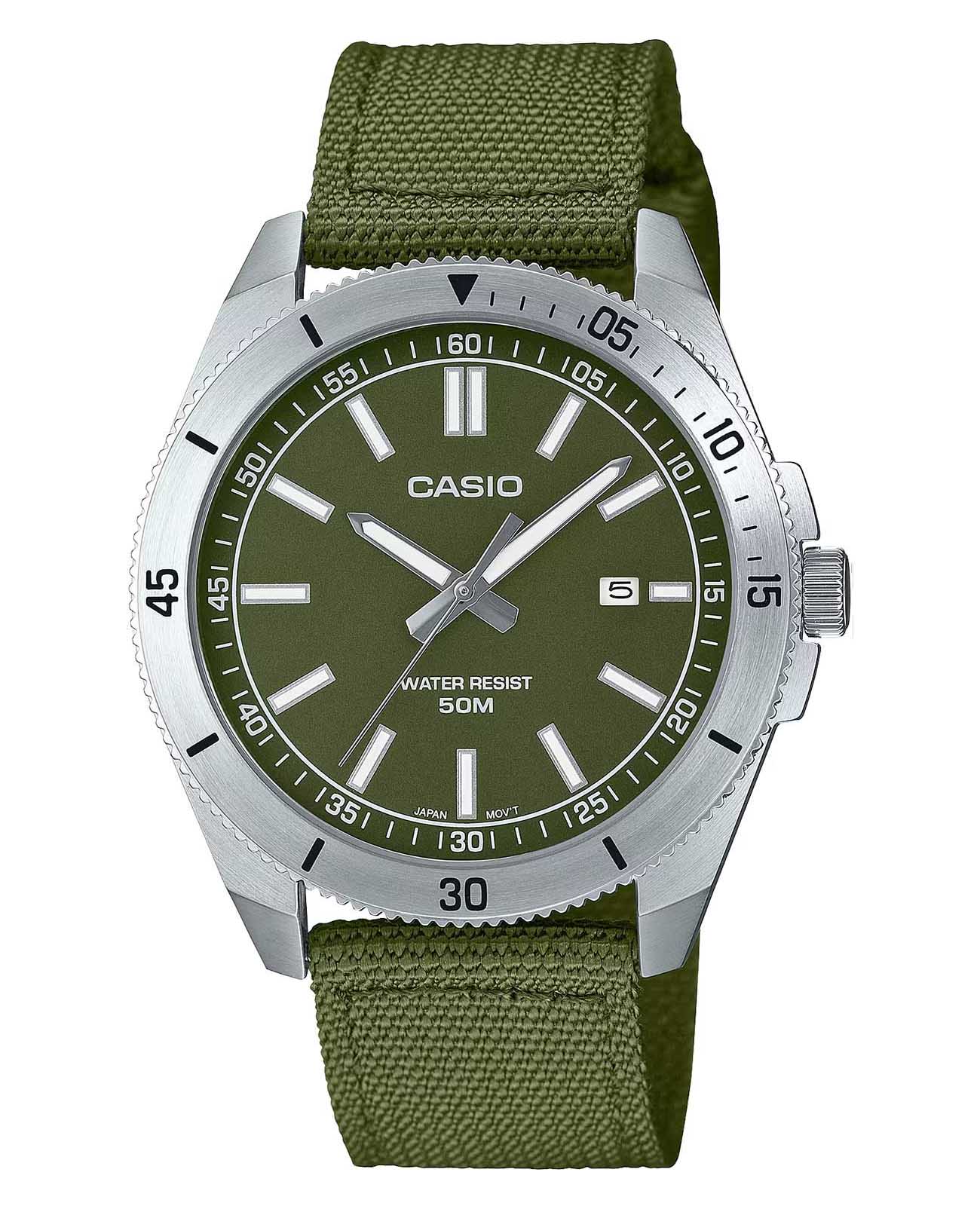 Спортивные японские мужские часы Casio Collection MTP-B155C-3EV с минеральным стекломМинеральное стеклоМинеральное стекло представляет собой искусственно выращенный минерал кварца. Такое стекло отличается особой устойчивостью к повреждениям и царапинам. Уступает по некоторым качествам сапфировому стеклу., устойчивым к мелким механическим повреждениям. Корпус часов изготовлен из нержавеющей стали. Вращающийся стальной безельБезельВнешний ободок, закрепляющий стекло. В спортивных часах так называется поворотное кольцо с делениями на циферблате, выполняет роль таймера – замеряет отрезки времени на шкале. Неподвижный безель – элемент декора. Однонаправленно вращающийся безель на дайверских часах позволяет фиксировать моменты погружения и выныривания на поверхность.. Стрелки и метки с люминесцентным покрытиемЛюминесцентное покрытиеПозволяет считывать показания времени в темноте. Производители наносят на стрелки, часовые индексы, безель или поверхность циферблата светонакопительный состав, дающий холодное свечение.. Задняя крышка с винтовым фиксатором. Батарейка рассчитана на 3 года. Окошко даты в положении 3 часа. Класс водозащиты: 50 метров, позволит защитить корпус от случайных брызг или капель дождя. Тканевый ремешок на стандартной застежке.