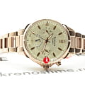 Белый циферблат с оригинальным узором и синими акцентами идеально смотрится в сочетании с цветом розового золота, такой оттенок был получен благодаря нанесению IP-покрытияIP-покрытиеМетод ионного напыления. Демонстрирует повышенную устойчивость к истиранию, окислению и химическим веществам. Под воздействием высокого давления и температуры около 1500°C молекулы металла надёжно соединяются с частицами корпуса часов.. В качестве декорирующих элементов использованы оригинальные кристаллы Swarovski с роскошным сиянием. Корпус и браслет выполнены из долговечной хирургической стали 316L. Минеральное стекло. Индикация даты и дня недели. Люминесцентная подсветкаЛюминесцентное покрытиеПозволяет считывать показания времени в темноте. Производители наносят на стрелки, часовые индексы, безель или поверхность циферблата светонакопительный состав, дающий холодное свечение.. Водозащита до 50 метров. Габариты: 41,4 x 45,3 x 11,2 мм.