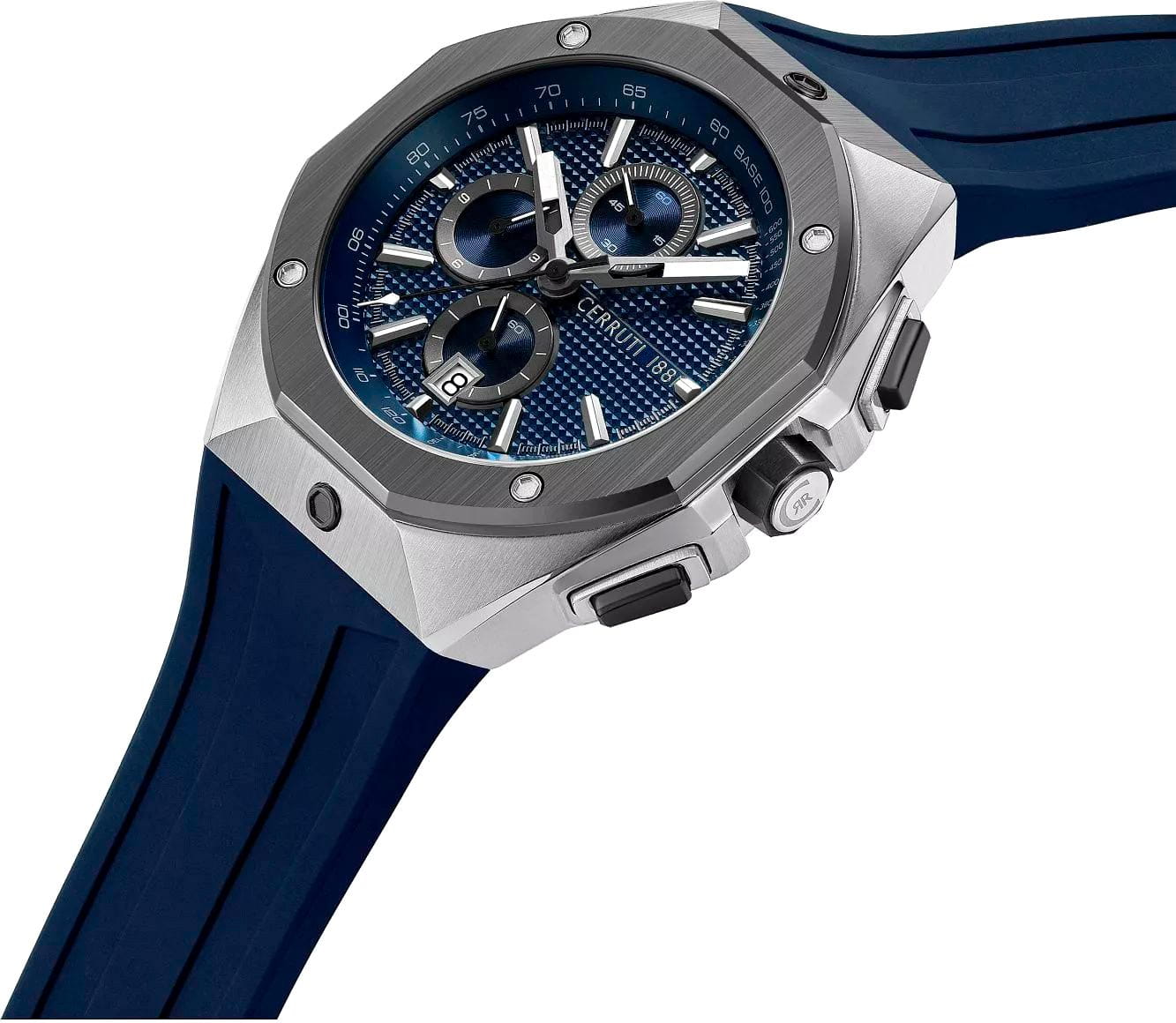 Cerruti 1881 CIWGO0073202 — выразительные мужские часы с мощным спортивным характером и акцентом на геометрическую точность форм. Корпус из нержавеющей стали с чётко очерченным восьмигранным безелемБезельВнешний ободок, закрепляющий стекло. В спортивных часах так называется поворотное кольцо с делениями на циферблате, выполняет роль таймера – замеряет отрезки времени на шкале. Неподвижный безель – элемент декора. Однонаправленно вращающийся безель на дайверских часах позволяет фиксировать моменты погружения и выныривания на поверхность. придаёт модели современный архитектурный облик, а насыщенный синий циферблат с рельефной структурой и тремя счётчиками хронографаХронографФункция позволяет измерять отрезки времени с особой точностью: часы, минуты, секунды. Верным признаком хронографа является наличие на циферблате 3 дополнительных окошек-счётчиков. подчёркивает её функциональность и динамику. Контрастные стрелки и метки с люминесцентным покрытиемЛюминесцентное покрытиеПозволяет считывать показания времени в темноте. Производители наносят на стрелки, часовые индексы, безель или поверхность циферблата светонакопительный состав, дающий холодное свечение. обеспечивают удобство считывания показаний в любое время суток, а устойчивое к повреждениям минеральное стеклоМинеральное стеклоМинеральное стекло представляет собой искусственно выращенный минерал кварца. Такое стекло отличается особой устойчивостью к повреждениям и царапинам. Уступает по некоторым качествам сапфировому стеклу. надёжно защищает циферблат. Эластичный силиконовый ремешок глубокого синего цвета гармонирует с общим тоном дизайна и гарантирует комфортное прилегание. Cerruti 1881— это стильное воплощение итальянской эстетики, объединяющее точность, уверенность и современную силу образа.