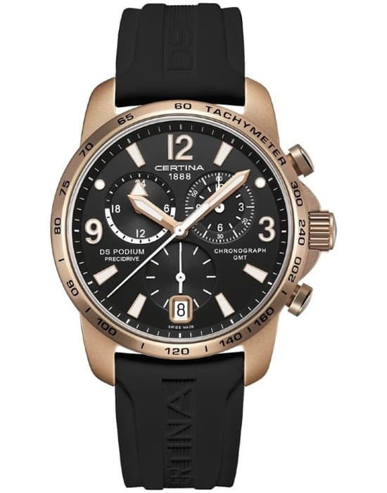 Каучуковый ремешок обеспечивает комфортное ношение. Швейцарский кварцевый механизм G10.962 BF Precidrive™Precidrive™Инновационный кварцевый механизм Certina. Часы, оснащённые этим швейцарским калибром, приравниваются к точности к сертифицированным хронометрам, точность хода составляет +/-10 секунд в год. отличается высокой точностью хода. Ультралёгкий алюминиевый корпус. Сапфировое стекло. ХронографХронографФункция позволяет измерять отрезки времени с особой точностью: часы, минуты, секунды. Верным признаком хронографа является наличие на циферблате 3 дополнительных окошек-счётчиков., календарь, GMTGMTОтображение времени второго часового пояса.Такая функция особенно актуальна для путешественников и бизнесменов,которые общаются с людьми из разных стран,теперь вы всегда будете знать,какой час у вашего партнёра или близкого человека., секундомер, тахиметрТахиметрРазмеченная шкала, располагается на ободке или безеле часов. Тахиметр позволяет рассчитать скорость на определённом участке пути, расстояние измеряется в километрах или милях..