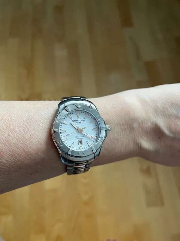 Компактный циферблат дополнен золотистыми деталями и привлекательным волновым узором, что стало выражением любви бренда к водной тематике. Отражением морского характера стал вращающийся безельБезельВнешний ободок, закрепляющий стекло. В спортивных часах так называется поворотное кольцо с делениями на циферблате, выполняет роль таймера – замеряет отрезки времени на шкале. Неподвижный безель – элемент декора. Однонаправленно вращающийся безель на дайверских часах позволяет фиксировать моменты погружения и выныривания на поверхность., водостойкость WR 300, завинчивающаяся заводная головка и задняя крышка. Высокая точность хода швейцарского кварцевого калибра F04.411 Precidrive™Precidrive™Инновационный кварцевый механизм Certina. Часы, оснащённые этим швейцарским калибром, приравниваются к точности к сертифицированным хронометрам, точность хода составляет +/-10 секунд в год. стала весомым основанием для получения сертификата хронометра COSCСертификат COSCОфициальный сертификат, подтверждающий то, что часы ходят с особо высокой точностью. Для получения документа часы подвергаются тестовым испытаниям, разработанным швейцарским институтом тестирования хронометров COSC. Допустимая норма для механических часов -4/+6 секунд в день, для кварцевых моделей +/- 0,07 секунд в день.. Система DS ConceptDS ConceptDouble Security Concept, обозначает двойную надёжность и безупречную точность часов Certina. Двойная система защиты подразумевает обеспечение максимальной устойчивости к ударам и высоких показателей водонепроницаемости.. Стальной ударопрочный корпусУдаропрочный корпусМеханизм заключён в корпус, выполненный из современных материалов, устойчивых к ударам, механическим повреждениям и падению с высоты: инновационный пластик, карбон, нержавеющая сталь, титан. и браслет. Сапфировое стекло с покрытием «антиблик». Индикатор EOLEOLПредставляет собой систему, уведомляющую владельца часов о необходимости замены элемента питания. За 2 недели до полного разряда батарейки секундная стрелка перестаёт ходить чётко и начинает перепрыгивать на 3-4 деления., отображение числа. Диаметр корпуса: 34 мм.