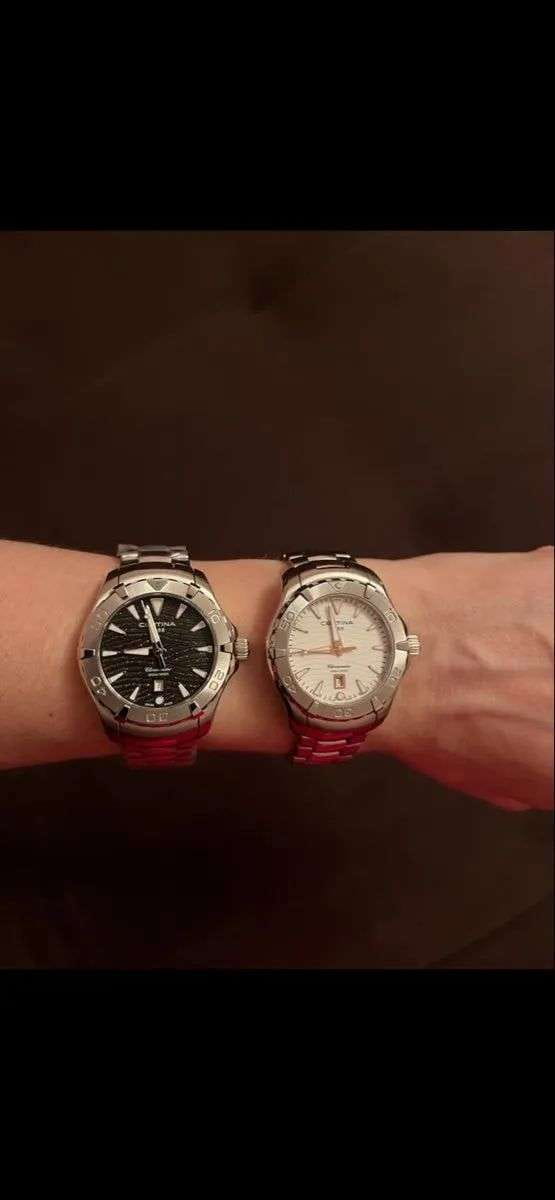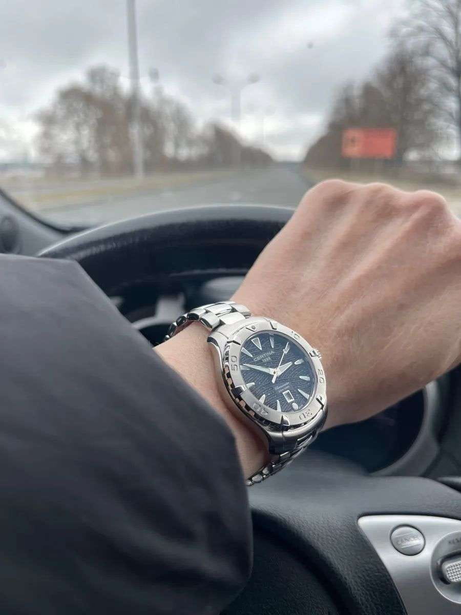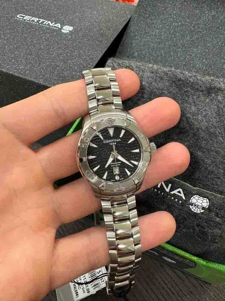 Компактный циферблат дополнен необычным узором в виде волн с блестящими акцентами, что стало выражением любви бренда Certina к морской стихии. Изящный аксессуар внутри просто «кремень», чему способствует система DS ConceptDS ConceptDouble Security Concept, обозначает двойную надёжность и безупречную точность часов Certina. Двойная система защиты подразумевает обеспечение максимальной устойчивости к ударам и высоких показателей водонепроницаемости.: водонепроницаемость 300 метров, завинчивающаяся задняя крышка и заводная головка с системой блокировки, сапфировое стекло, хирургическая сталь 316L. Швейцарский кварцевый механизм ETA F04.411 Precidrive™Precidrive™Инновационный кварцевый механизм Certina. Часы, оснащённые этим швейцарским калибром, приравниваются к точности к сертифицированным хронометрам, точность хода составляет +/-10 секунд в год. отмечен сертификатом хронометра COSCСертификат COSCОфициальный сертификат, подтверждающий то, что часы ходят с особо высокой точностью. Для получения документа часы подвергаются тестовым испытаниям, разработанным швейцарским институтом тестирования хронометров COSC. Допустимая норма для механических часов -4/+6 секунд в день, для кварцевых моделей +/- 0,07 секунд в день. за безупречную точность хода. Вращающийся безельБезельВнешний ободок, закрепляющий стекло. В спортивных часах так называется поворотное кольцо с делениями на циферблате, выполняет роль таймера – замеряет отрезки времени на шкале. Неподвижный безель – элемент декора. Однонаправленно вращающийся безель на дайверских часах позволяет фиксировать моменты погружения и выныривания на поверхность.. Яркая люминесцентная подсветкаЛюминесцентное покрытиеПозволяет считывать показания времени в темноте. Производители наносят на стрелки, часовые индексы, безель или поверхность циферблата светонакопительный состав, дающий холодное свечение.. Апертура даты, функция EOLEOLПредставляет собой систему, уведомляющую владельца часов о необходимости замены элемента питания. За 2 недели до полного разряда батарейки секундная стрелка перестаёт ходить чётко и начинает перепрыгивать на 3-4 деления.. Диаметр корпуса: 34 мм.