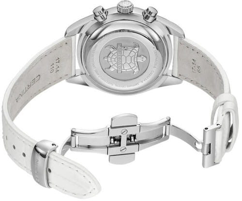 Женские швейцарские часы Certina DS-8 Lady Chronograph C033.234.36.048.01 из коллекции DS-8 – идеальное дополнение образа. Высокая точность хода швейцарского кварцевого калибра ETA G15.212 AA Precidrive™Precidrive™Инновационный кварцевый механизм Certina. Часы, оснащённые этим швейцарским калибром, приравниваются к точности к сертифицированным хронометрам, точность хода составляет +/-10 секунд в год. отмечена сертификатом COSCСертификат COSCОфициальный сертификат, подтверждающий то, что часы ходят с особо высокой точностью. Для получения документа часы подвергаются тестовым испытаниям, разработанным швейцарским институтом тестирования хронометров COSC. Допустимая норма для механических часов -4/+6 секунд в день, для кварцевых моделей +/- 0,07 секунд в день.. Сапфировое стеклоСапфировое стеклоПрочный и надёжный материал из кристалла сапфира синтетического происхождения, характеризующийся особой твёрдостью и устойчивостью к царапинам и повреждениям. с покрытием «антиблик». ХронографХронографФункция позволяет измерять отрезки времени с особой точностью: часы, минуты, секунды. Верным признаком хронографа является наличие на циферблате 3 дополнительных окошек-счётчиков., секундомер, дата, EOLEOLПредставляет собой систему, уведомляющую владельца часов о необходимости замены элемента питания. За 2 недели до полного разряда батарейки секундная стрелка перестаёт ходить чётко и начинает перепрыгивать на 3-4 деления.. Концепция Двойной Надёжности DSDS ConceptDouble Security Concept, обозначает двойную надёжность и безупречную точность часов Certina. Двойная система защиты подразумевает обеспечение максимальной устойчивости к ударам и высоких показателей водонепроницаемости.. Белый ремешок из натуральной кожи. Производство и сборка: Швейцария.