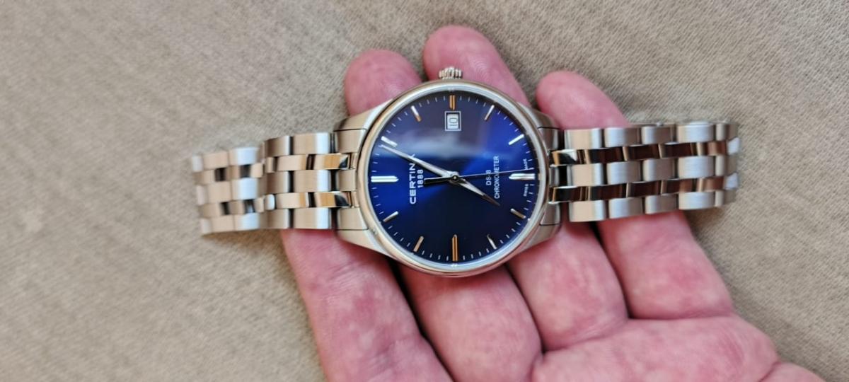 Металлический блеск нержавеющей стали 316L идеально сочетается с повседневным или деловым стилем в одежде, яркой деталью стал синий циферблат. Часы в универсальном исполнении измеряют время с абсолютной точностью, что подтверждено официальным сертификатом COSCСертификат COSCОфициальный сертификат, подтверждающий то, что часы ходят с особо высокой точностью. Для получения документа часы подвергаются тестовым испытаниям, разработанным швейцарским институтом тестирования хронометров COSC. Допустимая норма для механических часов -4/+6 секунд в день, для кварцевых моделей +/- 0,07 секунд в день.. Швейцарский кварцевый механизм ETA F07.412 Precidrive™Precidrive™Инновационный кварцевый механизм Certina. Часы, оснащённые этим швейцарским калибром, приравниваются к точности к сертифицированным хронометрам, точность хода составляет +/-10 секунд в год.. Повышенные ударопрочные свойства - концепция Двойной Надёжности DS ConceptDS ConceptDouble Security Concept, обозначает двойную надёжность и безупречную точность часов Certina. Двойная система защиты подразумевает обеспечение максимальной устойчивости к ударам и высоких показателей водонепроницаемости.. Сапфировое стекло с односторонней антибликовой обработкой. Водонепроницаемость 100 метров. Прямоугольная апертура даты. Индикатор EOLEOLПредставляет собой систему, уведомляющую владельца часов о необходимости замены элемента питания. За 2 недели до полного разряда батарейки секундная стрелка перестаёт ходить чётко и начинает перепрыгивать на 3-4 деления.. Диаметр корпуса: 40,2 мм.