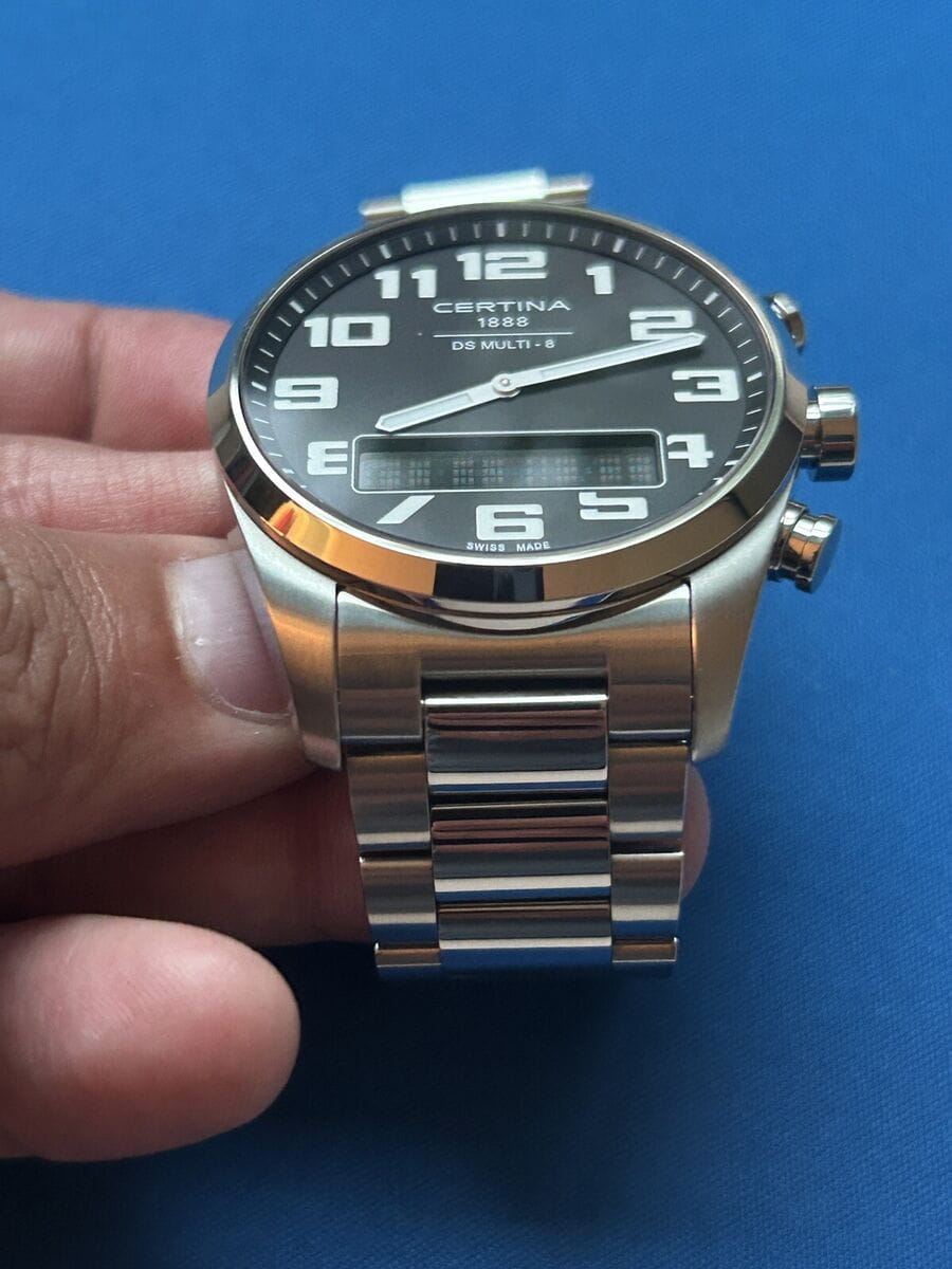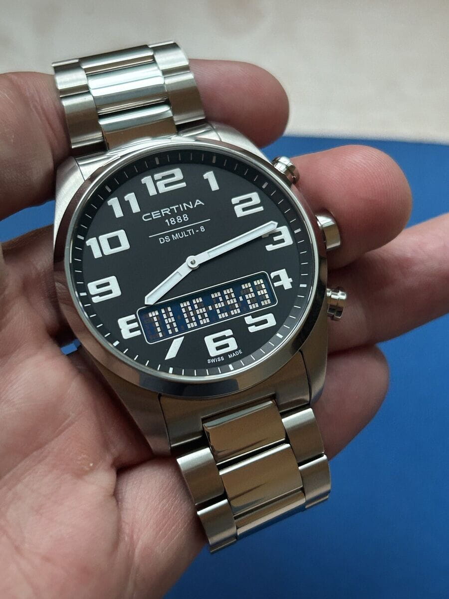 Мужские швейцарские кварцевые водонепроницаемые часы с будильникомБудильникБуди́льник — часы, в заданный момент времени подающие звуковой, световой и/или в редких случаях другой сигнал. Certina DS Multi C020.419.44.082.01, кварцевый механизм с высокой точностью. Сапфировое стеклоСапфировое стеклоПрочный и надёжный материал из кристалла сапфира синтетического происхождения, характеризующийся особой твёрдостью и устойчивостью к царапинам и повреждениям. устойчивое к появлению царапин, обладающее высокой прозрачностью. Класс водозащиты: 100 метров, позволит плавать, нырять и заниматься другими водными видами спорта. Корпус часов изготовлен из титана. Титановый браслет на раскладной застёжкеРаскладная застёжкаТакой тип застёжки используется только на браслетах из металла. Она никогда не раскрывается полностью, происходит разделение на 2 и более частей. Раскладывающая застёжка снизит вероятность потери часов к минимуму.. Круглый титановый корпус c сатинированной поверхностью. Стильный инверсионный матричный дисплей расширяет функционал часов. Второй часовой поясВторой часовой поясФункция, позволяющая отображать время двух часовых поясов одновременно. отображается на цифровом дисплее. Заостренные прямоугольные стрелки в стиле Baton с люминесцентным покрытиемЛюминесцентное покрытиеПозволяет считывать показания времени в темноте. Производители наносят на стрелки, часовые индексы, безель или поверхность циферблата светонакопительный состав, дающий холодное свечение., которое светится в темноте после непродолжительной зарядки на свету. Метки в виде арабских цифр. Задняя крышка крепится на винтах.