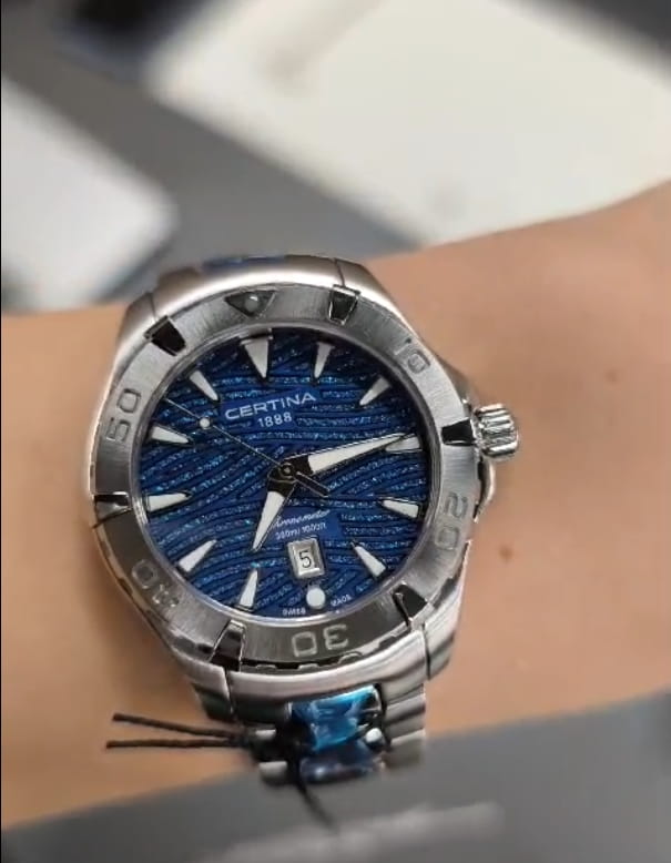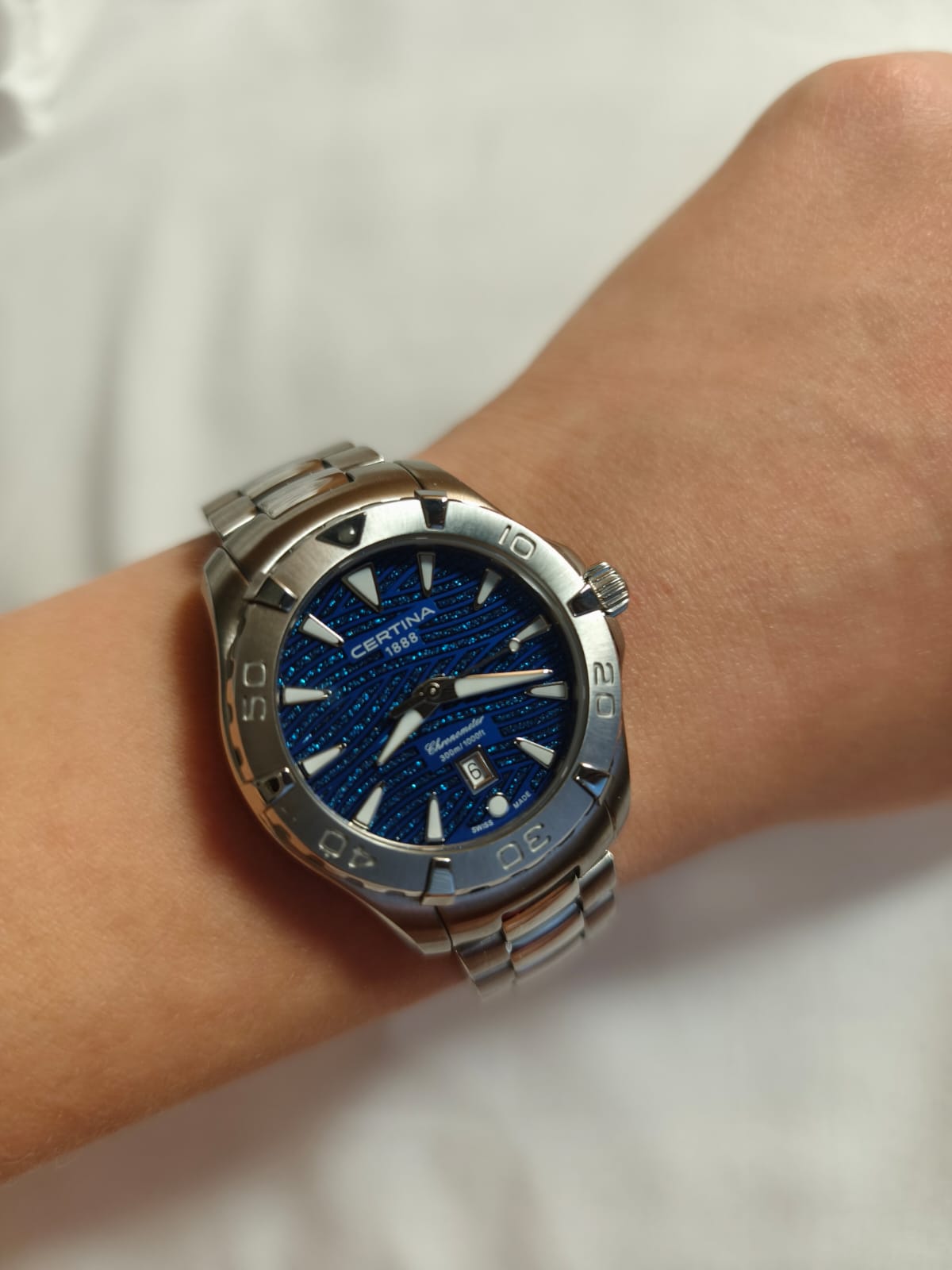 Компактный циферблат дополнен необычным узором в виде волн с блестящими акцентами, что стало выражением любви бренда Certina к морской стихии. Изящный аксессуар внутри просто «кремень», чему способствует система DS ConceptDS ConceptDouble Security Concept, обозначает двойную надёжность и безупречную точность часов Certina. Двойная система защиты подразумевает обеспечение максимальной устойчивости к ударам и высоких показателей водонепроницаемости.: водонепроницаемость 300 метров, завинчивающаяся задняя крышка и заводная головка с системой блокировки, сапфировое стекло, хирургическая сталь 316L. Швейцарский кварцевый механизм ETA F04.411 Precidrive™Precidrive™Инновационный кварцевый механизм Certina. Часы, оснащённые этим швейцарским калибром, приравниваются к точности к сертифицированным хронометрам, точность хода составляет +/-10 секунд в год. отмечен сертификатом хронометра COSCСертификат COSCОфициальный сертификат, подтверждающий то, что часы ходят с особо высокой точностью. Для получения документа часы подвергаются тестовым испытаниям, разработанным швейцарским институтом тестирования хронометров COSC. Допустимая норма для механических часов -4/+6 секунд в день, для кварцевых моделей +/- 0,07 секунд в день. за безупречную точность хода. Вращающийся безельБезельВнешний ободок, закрепляющий стекло. В спортивных часах так называется поворотное кольцо с делениями на циферблате, выполняет роль таймера – замеряет отрезки времени на шкале. Неподвижный безель – элемент декора. Однонаправленно вращающийся безель на дайверских часах позволяет фиксировать моменты погружения и выныривания на поверхность.. Яркая люминесцентная подсветкаЛюминесцентное покрытиеПозволяет считывать показания времени в темноте. Производители наносят на стрелки, часовые индексы, безель или поверхность циферблата светонакопительный состав, дающий холодное свечение.. Апертура даты, функция EOLEOLПредставляет собой систему, уведомляющую владельца часов о необходимости замены элемента питания. За 2 недели до полного разряда батарейки секундная стрелка перестаёт ходить чётко и начинает перепрыгивать на 3-4 деления.. Диаметр корпуса: 34 мм.