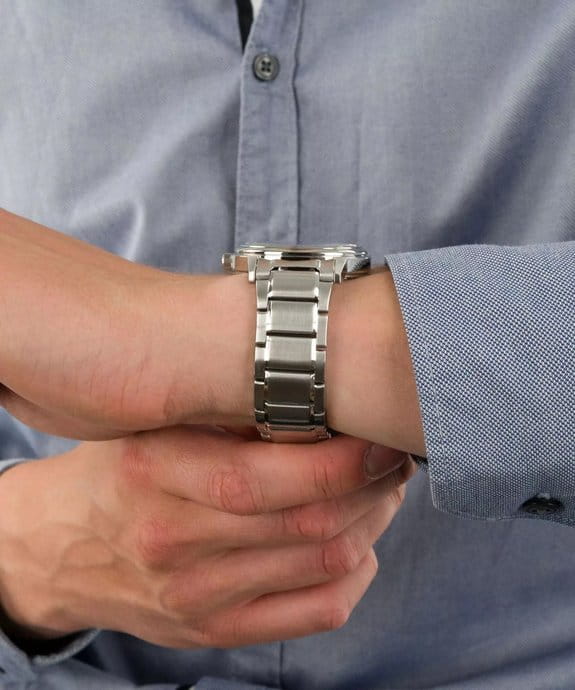 Часы Citizen AW1670-82L – это стильный и практичный аксессуар, созданный в Японии, который подчеркнет статус и вкус своего владельца. Модель оснащена современным кварцевым механизмом с калибром Citizen J810 и инновационной системой Eco-Drive, позволяющей заряжать часы от солнечного света и обеспечивающей автономную работу до 240 дней без необходимости замены батарейки. Прочный корпус диаметром 41,5 мм выполнен из высококачественной стали, а элегантный синий циферблат украшен метками в виде штрихов и римских цифр, дополнен окошком даты для удобства. Минеральное стеклоМинеральное стеклоМинеральное стекло представляет собой искусственно выращенный минерал кварца. Такое стекло отличается особой устойчивостью к повреждениям и царапинам. Уступает по некоторым качествам сапфировому стеклу. надежно защищает циферблат от царапин, а водозащита 100WR позволяет не беспокоиться о случайном контакте с водой. Стальной браслет оборудован раскладной застёжкойРаскладная застёжкаТакой тип застёжки используется только на браслетах из металла. Она никогда не раскрывается полностью, происходит разделение на 2 и более частей. Раскладывающая застёжка снизит вероятность потери часов к минимуму. с системой блокировки, обеспечивающей надежную фиксацию на запястье. Завинчивающаяся задняя крышка повышает герметичность корпуса. Часы весят 130 граммов и имеют оптимальную толщину 10,3 мм, что делает их удобными для ежедневного ношения.