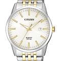 Часы Citizen BI5006-81P сочетают в себе японское качество, современный дизайн и надежность кварцевого механизма Citizen G111. Круглый корпус диаметром 39 мм выполнен из прочной нержавеющей стали, что обеспечивает долговечность и стильный внешний вид. Белый циферблат украшен метками в виде штрихов, а также дополнен окошком календаря с отображением даты и дня недели в позиции «3 часа». Стрелки с люминесцентным покрытиемЛюминесцентное покрытиеПозволяет считывать показания времени в темноте. Производители наносят на стрелки, часовые индексы, безель или поверхность циферблата светонакопительный состав, дающий холодное свечение., что обеспечивает отличную видимость в темноте. Минеральное стеклоМинеральное стеклоМинеральное стекло представляет собой искусственно выращенный минерал кварца. Такое стекло отличается особой устойчивостью к повреждениям и царапинам. Уступает по некоторым качествам сапфировому стеклу. защищает циферблат от царапин и повреждений. Рифленая заводная головка подчеркивает элегантность и практичность модели. Стальной браслет с частичным золотистым IP-покрытиемIP-покрытиеМетод ионного напыления. Демонстрирует повышенную устойчивость к истиранию, окислению и химическим веществам. Под воздействием высокого давления и температуры около 1500°C молекулы металла надёжно соединяются с частицами корпуса часов. оснащен надежной раскладной застёжкойРаскладная застёжкаТакой тип застёжки используется только на браслетах из металла. Она никогда не раскрывается полностью, происходит разделение на 2 и более частей. Раскладывающая застёжка снизит вероятность потери часов к минимуму., что обеспечивает комфортное ношение и подходит для любого случая. Водозащита до 50 метров позволяет не бояться случайных брызг и дождя.