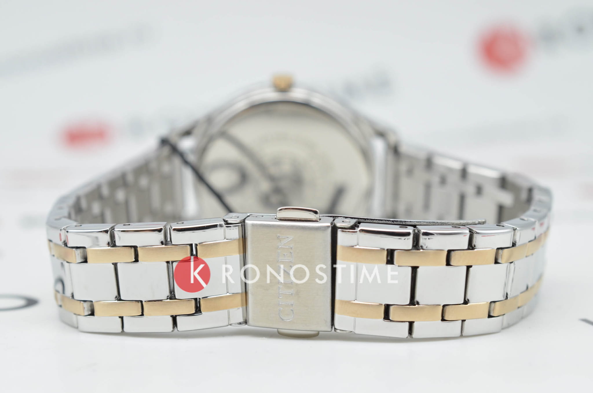 Часы Citizen EM0506-77A— это стильная модель, сочетающая в себе утонченную классику и современные технологии. Корпус изготовлен из прочной нержавеющей стали, а безельБезельВнешний ободок, закрепляющий стекло. В спортивных часах так называется поворотное кольцо с делениями на циферблате, выполняет роль таймера – замеряет отрезки времени на шкале. Неподвижный безель – элемент декора. Однонаправленно вращающийся безель на дайверских часах позволяет фиксировать моменты погружения и выныривания на поверхность. и браслет (частично) с золотистым IP-покрытиемIP-покрытиеМетод ионного напыления. Демонстрирует повышенную устойчивость к истиранию, окислению и химическим веществам. Под воздействием высокого давления и температуры около 1500°C молекулы металла надёжно соединяются с частицами корпуса часов., что обеспечивает не только износостойкость, но и элегантный внешний вид. Белый циферблат отличается кристаллами и лаконичным оформлением и защищён надёжным минеральным стекломМинеральное стеклоМинеральное стекло представляет собой искусственно выращенный минерал кварца. Такое стекло отличается особой устойчивостью к повреждениям и царапинам. Уступает по некоторым качествам сапфировому стеклу., устойчивым к царапинам. Часы оснащены инновационной системой Eco-Drive, которая позволяет заряжаться от любого источника света и не требует замены батарейки, а запас энергии составляет до 180 дней. Механизм Citizen E031 гарантирует точность хода, а функция индикации заряда EOLEOLПредставляет собой систему, уведомляющую владельца часов о необходимости замены элемента питания. За 2 недели до полного разряда батарейки секундная стрелка перестаёт ходить чётко и начинает перепрыгивать на 3-4 деления. своевременно подскажет о необходимости подзарядки. Водозащита до 50 метров обеспечивает дополнительную практичность и защищает механизм от влаги при повседневном использовании. Браслет шириной 14 мм и длиной 143 мм удобно фиксируется на запястье с помощью раскладной застёжкиРаскладная застёжкаТакой тип застёжки используется только на браслетах из металла. Она никогда не раскрывается полностью, происходит разделение на 2 и более частей. Раскладывающая застёжка снизит вероятность потери часов к минимуму. с системой блокировки, что обеспечивает надёжность и комфорт в течение всего дня. Диаметр корпуса составляет 32 мм, а толщина — 7,6 мм, благодаря чему часы выглядят изящно и подходят для любого случая. Citizen