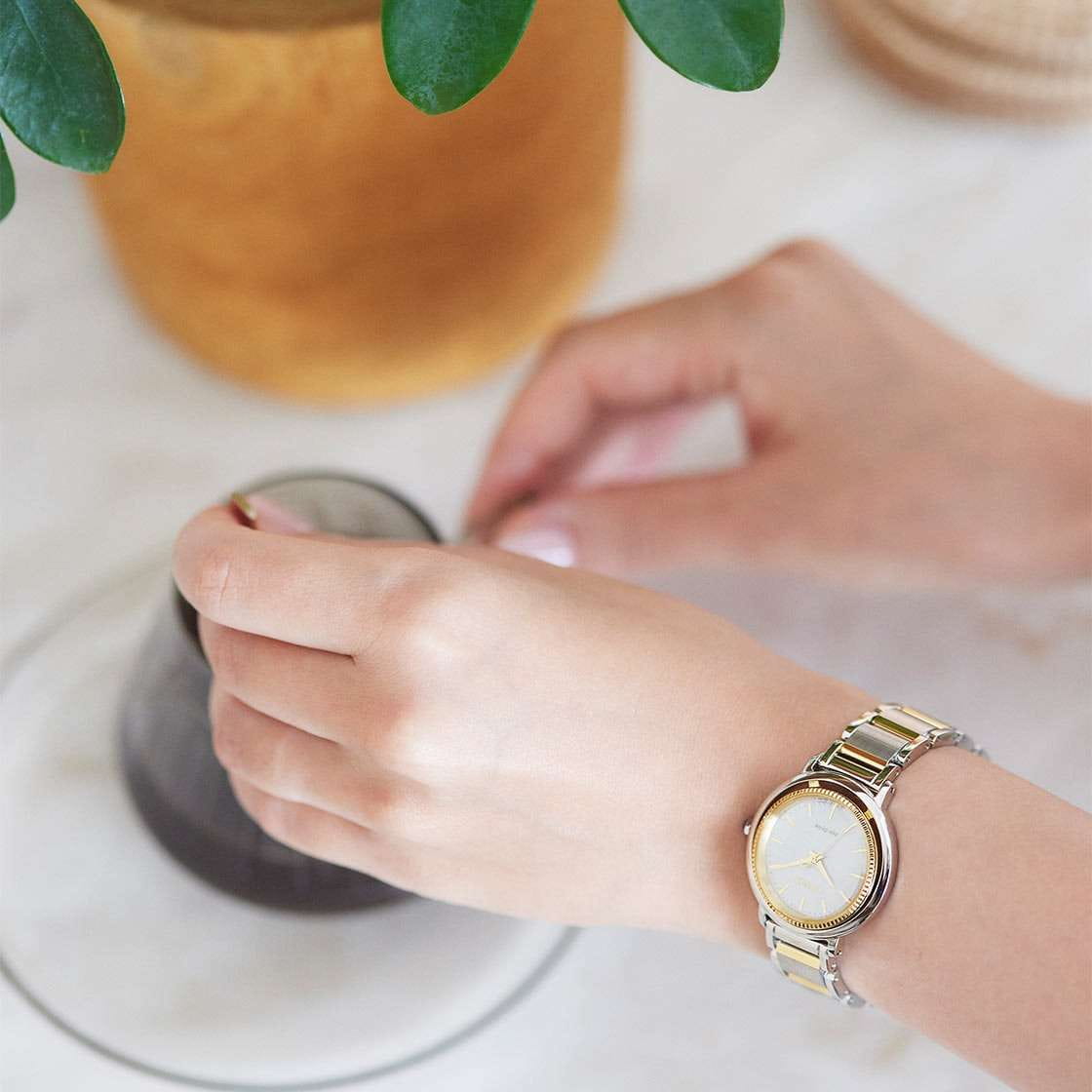 Элегантные часы Citizen EM1104-83D произведены в Японии и оснащены современным кварцевым механизмом Citizen E031 с инновационной системой Eco-Drive, которая использует энергию солнечного света и не требует замены батарейки, обеспечивая до 180 дней работы в автономном режиме. Корпус выполнен из высококачественной нержавеющей стали, а браслет с частичным золотым IP-покрытиемIP-покрытиеМетод ионного напыления. Демонстрирует повышенную устойчивость к истиранию, окислению и химическим веществам. Под воздействием высокого давления и температуры около 1500°C молекулы металла надёжно соединяются с частицами корпуса часов., что гарантирует долговечность и износостойкость. Перламутровый голубой и розовый циферблат с изящными штриховыми метками защищён выпуклым сапфировым стекломСапфировое стеклоПрочный и надёжный материал из кристалла сапфира синтетического происхождения, характеризующийся особой твёрдостью и устойчивостью к царапинам и повреждениям., устойчивым к царапинам. БезельБезельВнешний ободок, закрепляющий стекло. В спортивных часах так называется поворотное кольцо с делениями на циферблате, выполняет роль таймера – замеряет отрезки времени на шкале. Неподвижный безель – элемент декора. Однонаправленно вращающийся безель на дайверских часах позволяет фиксировать моменты погружения и выныривания на поверхность. часов с золотистым IP-покрытиемIP-покрытиеМетод ионного напыления. Демонстрирует повышенную устойчивость к истиранию, окислению и химическим веществам. Под воздействием высокого давления и температуры около 1500°C молекулы металла надёжно соединяются с частицами корпуса часов. декорирован алмазной гранью, а заводная головка украшена камнем в форме кабошона, что придаёт модели особый шарм. Задняя крышка закреплена на четырёх винтах, что повышает надёжность конструкции. Часы имеют водозащиту до 50 метров, а также функцию индикации заряда и предотвращения перезарядки. Размер корпуса составляет 31,2 мм в диаметре и 8 мм в толщину, вес — 71 грамм. Застежка «бабочка»Застёжка "бабочка"Такой вид застёжки дополняется предохранителями, помогающими избежать случайного раскрытия браслета. Обладают изящным исполнением. у браслета обеспечивает комфортное и надёжное ношение. Эта модель идеально подчеркнёт изысканный стиль и индивидуальность своей обладательницы.