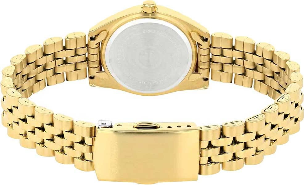 Элегантные часы Citizen EU6062-50P сочетают в себе изысканный дизайн и надежность японского качества. Круглый корпус диаметром 26 мм изготовлен из нержавеющей стали с PVD-покрытиемPVDУльтратонкое покрытие наносится в технике вакуумного напыления, сочетает в себе нитрид титана особой прочности со слоем золота или оксида хрома. Несёт в себе декоративную или защитную функцию. цвета желтого золота и украшен сверкающими кристаллами по безелюБезельВнешний ободок, закрепляющий стекло. В спортивных часах так называется поворотное кольцо с делениями на циферблате, выполняет роль таймера – замеряет отрезки времени на шкале. Неподвижный безель – элемент декора. Однонаправленно вращающийся безель на дайверских часах позволяет фиксировать моменты погружения и выныривания на поверхность., что придает модели утонченный вид. Циферблат цвета шампань дополнен центральными стрелками и апертурой даты на позиции 3 часов. Минеральное стеклоМинеральное стеклоМинеральное стекло представляет собой искусственно выращенный минерал кварца. Такое стекло отличается особой устойчивостью к повреждениям и царапинам. Уступает по некоторым качествам сапфировому стеклу. защищает от мелких повреждений, а стальной браслет с раскладной застёжкойРаскладная застёжкаТакой тип застёжки используется только на браслетах из металла. Она никогда не раскрывается полностью, происходит разделение на 2 и более частей. Раскладывающая застёжка снизит вероятность потери часов к минимуму. обеспечивает комфортную посадку. Стрелки с люминесцентным покрытиемЛюминесцентное покрытиеПозволяет считывать показания времени в темноте. Производители наносят на стрелки, часовые индексы, безель или поверхность циферблата светонакопительный состав, дающий холодное свечение. для отличной читаемости в любое время суток. Благодаря водостойкости WR 50 часы подходят для повседневного ношения, включая мытье рук и дождь.