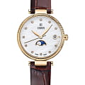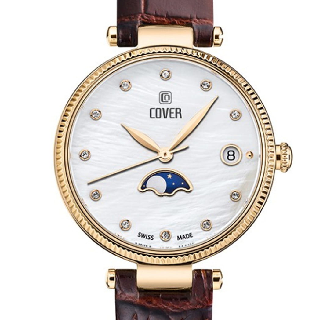 Женские часы Cover Moon CO196.05 - это аксессуар для истинных леди из коллекции Fly Me To The Moon. Часы работают на кварцевом калибре ETA. Циферблат выполнен в белом перламутровом исполнении, создавая игру света при каждом движении запястья, и украшен 11 кристаллами Swarovski, которые служат часовым индикатором, добавляя блики света и роскоши. Кроме того, модель имеет окно фаз Луны на «6 часах» и апертуру даты на «3 часах», что делает ее функциональной для ценителей астрономических усложнений. Часы имеют 32-миллиметровый корпус из нержавеющей стали с PVD-покрытиемPVDУльтратонкое покрытие наносится в технике вакуумного напыления, сочетает в себе нитрид титана особой прочности со слоем золота или оксида хрома. Несёт в себе декоративную или защитную функцию. цвета желтого золота. Водонепроницаемость часов достигает 5 атмосфер (WR 50), что позволяет использовать их в повседневной жизни, однако не рекомендуется для контакта с водой во время плавания или дайвинга. Маркировка «Swiss Made». Кожаный ремешок на классической застежке.
