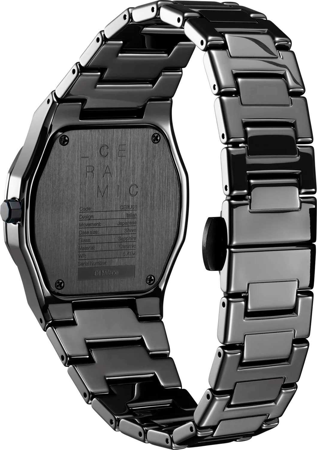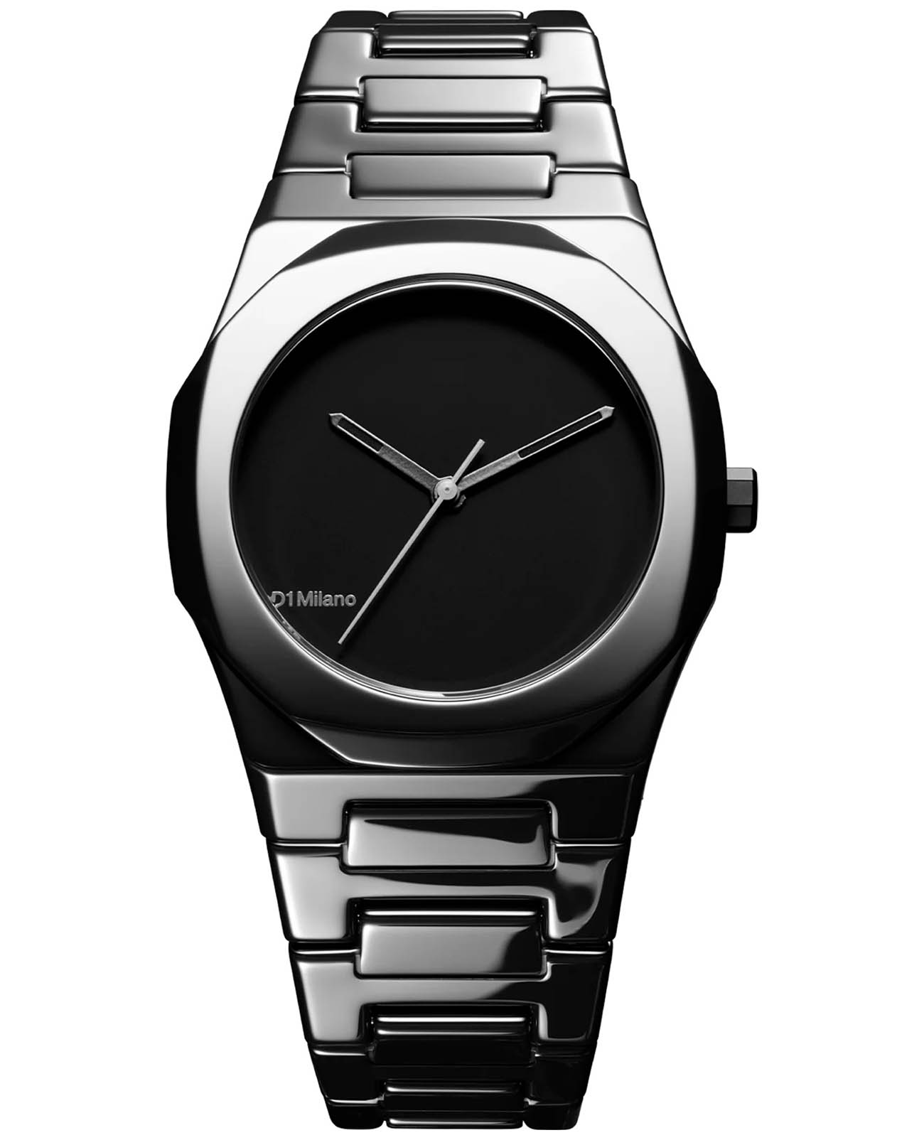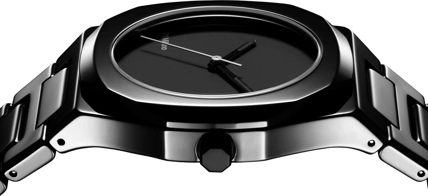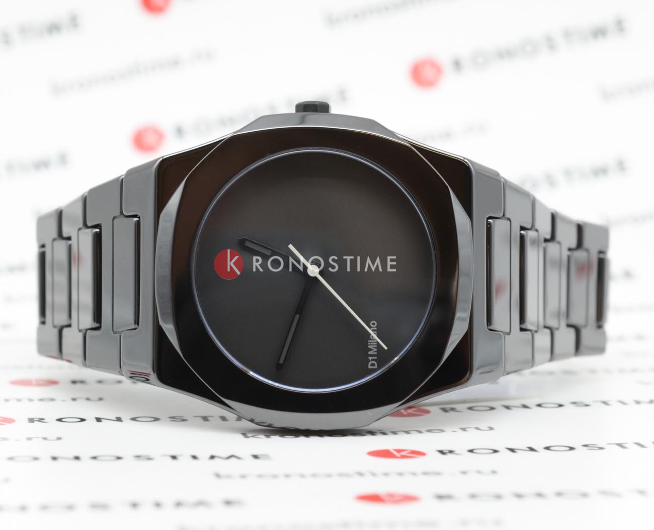 Часы D1 Milano Ceramic CEBU01 Pure Black  – роскошный аксессуар для современных мужчин. Кварцевые часы с корпусом из черной отполированной керамики. Циферблат лаконичный, без индексов, с надписью бренда. Стрелки с люминесцентным покрытиемЛюминесцентное покрытиеПозволяет считывать показания времени в темноте. Производители наносят на стрелки, часовые индексы, безель или поверхность циферблата светонакопительный состав, дающий холодное свечение.. Стальная задняя крышка с PVD-покрытиемPVDУльтратонкое покрытие наносится в технике вакуумного напыления, сочетает в себе нитрид титана особой прочности со слоем золота или оксида хрома. Несёт в себе декоративную или защитную функцию. закреплена на 4 винтах, что обеспечивает надежность конструкции. Керамический браслет с застёжкой «бабочка» с кнопкамиЗастёжка "бабочка"Такой вид застёжки дополняется предохранителями, помогающими избежать случайного раскрытия браслета. Обладают изящным исполнением. . Часы сочетают в себе классический дизайн и современные технологии производства.