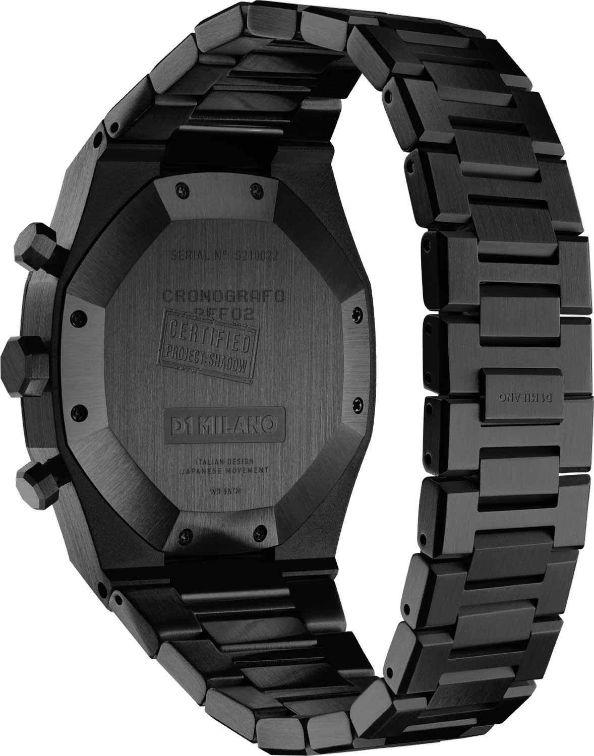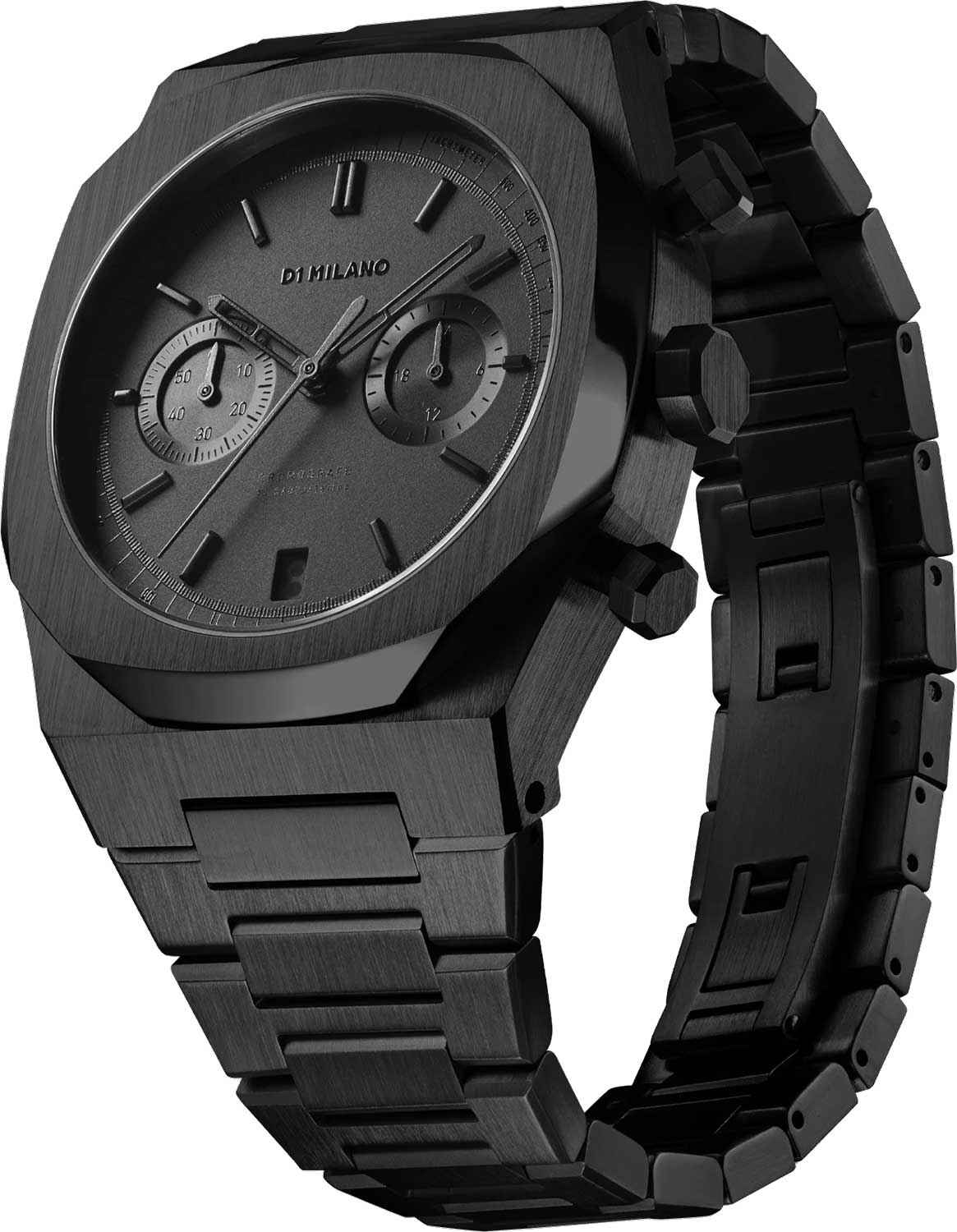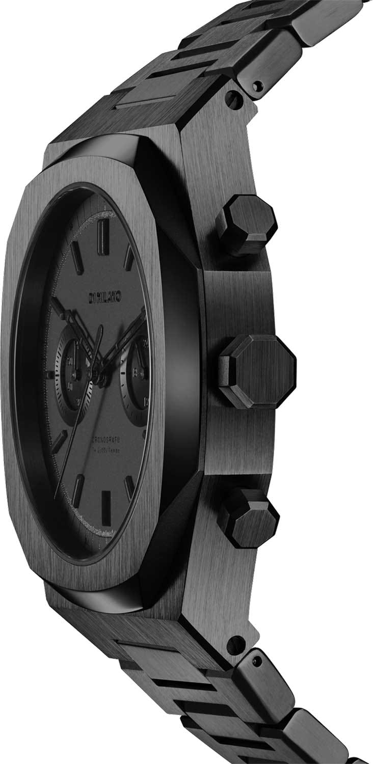 Элегантный хронограф D1 Milano Cronografo CHBJSH Shadow - идеальное воплощение мужественности и стиля. Этот многофункциональный аксессуар оснащен секундомером,тахиметромТахиметрРазмеченная шкала, располагается на ободке или безеле часов. Тахиметр позволяет рассчитать скорость на определённом участке пути, расстояние измеряется в километрах или милях. и двойным форматом времени, что делает его незаменимым компаньоном в повседневной жизни. Корпус и браслет выполнены из стали с PVD-покрытиемPVDУльтратонкое покрытие наносится в технике вакуумного напыления, сочетает в себе нитрид титана особой прочности со слоем золота или оксида хрома. Несёт в себе декоративную или защитную функцию.. Минималистичный дизайн циферблата с штриховыми метками, защищенный прочным сапфировым стекломСапфировое стеклоПрочный и надёжный материал из кристалла сапфира синтетического происхождения, характеризующийся особой твёрдостью и устойчивостью к царапинам и повреждениям., привлекает внимание своей сдержанной красотой. Надежная конструкция с задней крышкой на 8 винтах и стильный браслет с удобной застежкой обеспечивают комфорт при ношении. Каждый экземпляр уникален благодаря индивидуальному серийному номеру. Shadow- это не просто часы, а статусный аксессуар, подчеркивающий безупречный вкус и внимание к деталям своего владельца.