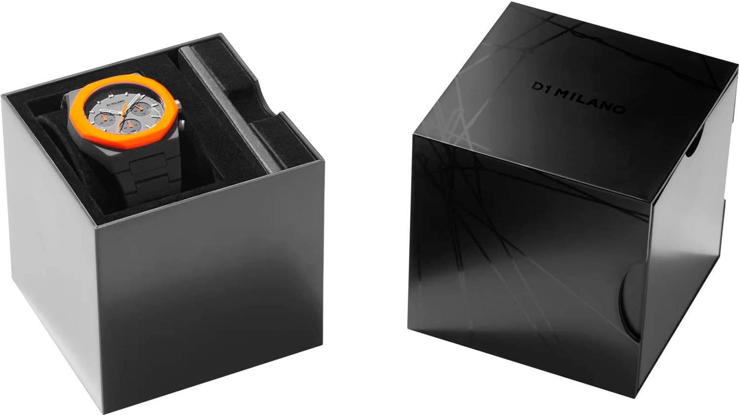 Часы D1 Milano PHBJ01 — это элегантные кварцевые часы, которые впечатляют своим функциональным дизайном, подходят как для мужчин, так и для женщин. Их высокая надежность превращает эти часы в незаменимый аксессуар на каждый день. ХронографХронографФункция позволяет измерять отрезки времени с особой точностью: часы, минуты, секунды. Верным признаком хронографа является наличие на циферблате 3 дополнительных окошек-счётчиков. оснащен секундомеромСекундомерСекундоме́р — прибор, способный измерять интервалы времени с точностью до долей секунды. и серым циферблатом, защищенным минеральным стекломМинеральное стеклоМинеральное стекло представляет собой искусственно выращенный минерал кварца. Такое стекло отличается особой устойчивостью к повреждениям и царапинам. Уступает по некоторым качествам сапфировому стеклу.. На циферблате расположены накладные метки в виде штрихов и три дополнительных циферблата с оранжевыми стрелками, а также окошко календаря в районе отметки 6 часов. Пластиковый оранжевый безельБезельВнешний ободок, закрепляющий стекло. В спортивных часах так называется поворотное кольцо с делениями на циферблате, выполняет роль таймера – замеряет отрезки времени на шкале. Неподвижный безель – элемент декора. Однонаправленно вращающийся безель на дайверских часах позволяет фиксировать моменты погружения и выныривания на поверхность. отлично сочетается с черным пластиковым браслетом, застежкой «бабочка»Застёжка "бабочка"Такой вид застёжки дополняется предохранителями, помогающими избежать случайного раскрытия браслета. Обладают изящным исполнением. . Стальная задняя крышка этих часов крепится на 4-х винтах. Водонепроницаемость до 50 метров делает эти часы идеальным выбором для повседневного использования.