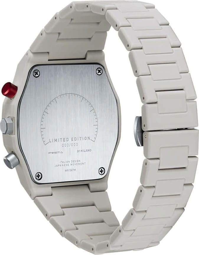 Часы D1 Milano x Prema PHBJPR — это элегантные кварцевые часы, которые впечатляют своим функциональным дизайном. Высокая надежность превращает эти часы в незаменимый аксессуар на каждый день. Модель оснащена хронографомХронографФункция позволяет измерять отрезки времени с особой точностью: часы, минуты, секунды. Верным признаком хронографа является наличие на циферблате 3 дополнительных окошек-счётчиков., секундомеромСекундомерСекундоме́р — прибор, способный измерять интервалы времени с точностью до долей секунды. и циферблатом, защищенным минеральным стекломМинеральное стеклоМинеральное стекло представляет собой искусственно выращенный минерал кварца. Такое стекло отличается особой устойчивостью к повреждениям и царапинам. Уступает по некоторым качествам сапфировому стеклу.  с антибликовым покрытиемАнтибликовое покрытиеСлой оксида металла в 0,13-0,3 микрон, благодаря которому стекло часов не бликует и не отражает свет. Антибликовое покрытие уменьшает отражение света в 10 раз, обеспечивая отличную читаемость показателей циферблата.. Изысканный корпус из поликарбоната с покрытием Софт-Тач. На циферблате расположены накладные метки в виде штрихов и три дополнительных циферблата, а также окошко календаря в положении между отметками 4 и 5 часов. Пластиковый браслет с застежкой «бабочка»Застёжка "бабочка"Такой вид застёжки дополняется предохранителями, помогающими избежать случайного раскрытия браслета. Обладают изящным исполнением. . Стальная задняя крышка этих часов крепится на 4-х винтах. Водонепроницаемость до 50 метров делает эти часы идеальным выбором для повседневного использования. Лимитированная серия — 300 экземпляров.