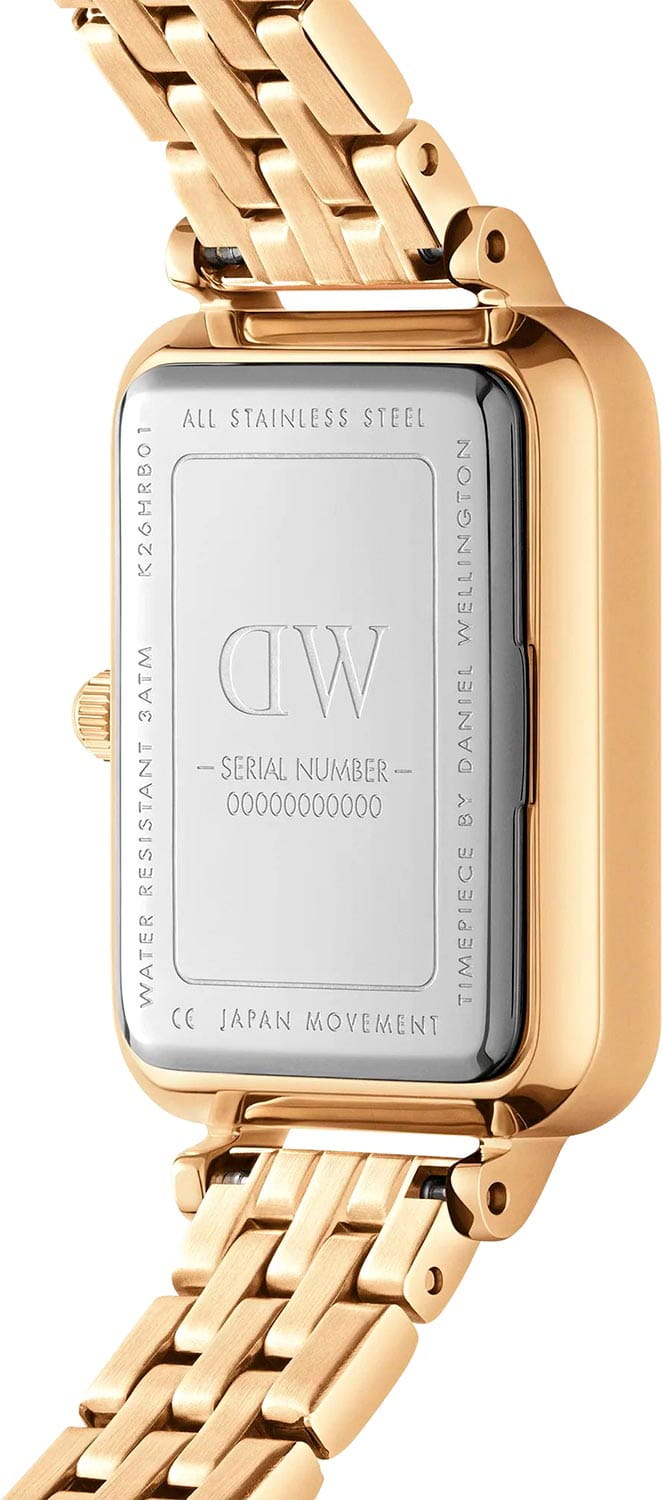 Женские наручные часы с минеральным стекломМинеральное стеклоМинеральное стекло представляет собой искусственно выращенный минерал кварца. Такое стекло отличается особой устойчивостью к повреждениям и царапинам. Уступает по некоторым качествам сапфировому стеклу. Daniel Wellington Quadro Roman Numerals 5-Link Gold DW00100688, кварцевый механизм с высокой точностью. Корпус часов изготовлен из нержавеющей стали 316L PVD-покрытиемPVDУльтратонкое покрытие наносится в технике вакуумного напыления, сочетает в себе нитрид титана особой прочности со слоем золота или оксида хрома. Несёт в себе декоративную или защитную функцию.. Циферблат с аккуратными римскими индексами. Японский кварцевый механизм. Рифленая заводная головка. Класс водозащиты: 30 метров, позволит защитить корпус от случайных брызг или капель дождя. Стальной браслет с PVD-покрытиемPVDУльтратонкое покрытие наносится в технике вакуумного напыления, сочетает в себе нитрид титана особой прочности со слоем золота или оксида хрома. Несёт в себе декоративную или защитную функцию. на застежке бабочкеЗастёжка "бабочка"Такой вид застёжки дополняется предохранителями, помогающими избежать случайного раскрытия браслета. Обладают изящным исполнением. .