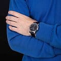 черным гильоше. Стрелки и метки с люминесцентной подсветкойЛюминесцентное покрытиеПозволяет считывать показания времени в темноте. Производители наносят на стрелки, часовые индексы, безель или поверхность циферблата светонакопительный состав, дающий холодное свечение.. Окошко даты находится в положении 6 часов. Прозрачная задняя крышка. Класс водозащиты: 50 метров, позволит защитить корпус от случайных брызг или капель дождя. Кожаный ремешок на стандартной застёжке.