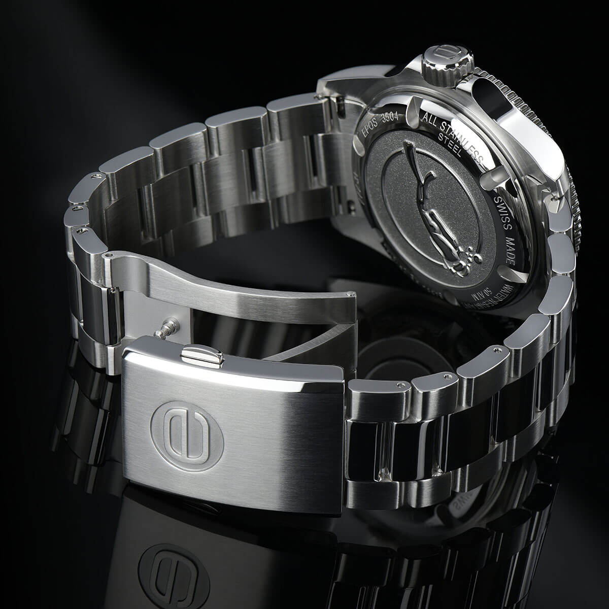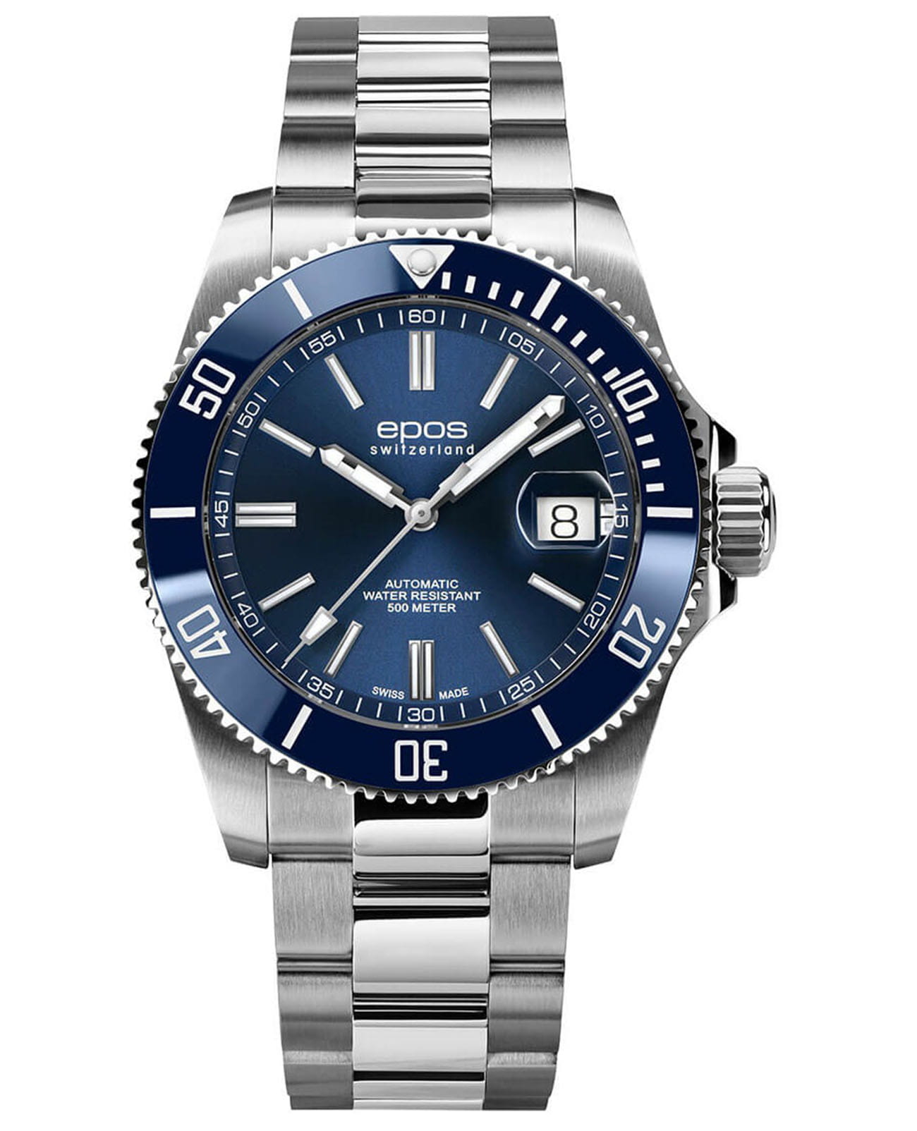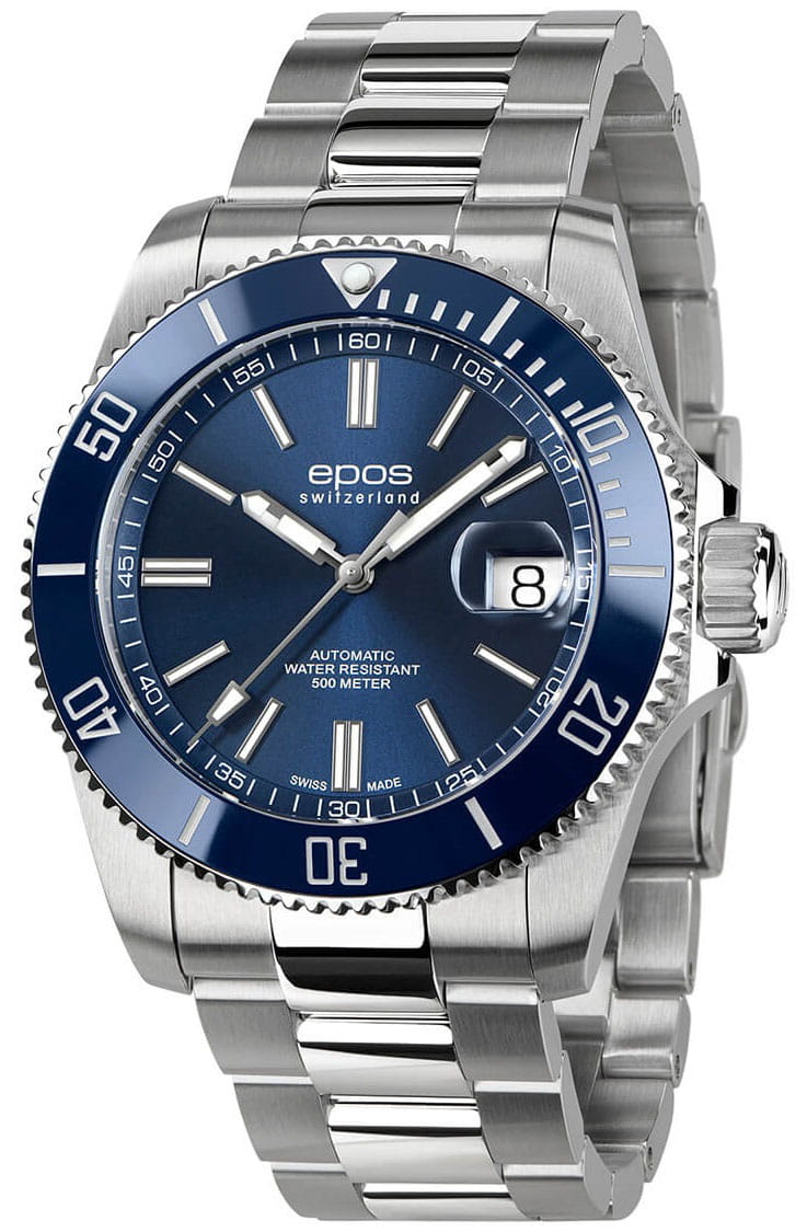 Мужские швейцарские механические часы с автоподзаводом Epos  Diver 3504.131.96.16.30. Сапфировое стеклоСапфировое стеклоПрочный и надёжный материал из кристалла сапфира синтетического происхождения, характеризующийся особой твёрдостью и устойчивостью к царапинам и повреждениям. устойчивое к появлению царапин, обладающее высокой прозрачностью. Корпус и браслет часов изготовлен из нержавеющей стали. Врачающийся в одном направлении безельБезельВнешний ободок, закрепляющий стекло. В спортивных часах так называется поворотное кольцо с делениями на циферблате, выполняет роль таймера – замеряет отрезки времени на шкале. Неподвижный безель – элемент декора. Однонаправленно вращающийся безель на дайверских часах позволяет фиксировать моменты погружения и выныривания на поверхность. из нержавеющей стали с PVDPVDУльтратонкое покрытие наносится в технике вакуумного напыления, сочетает в себе нитрид титана особой прочности со слоем золота или оксида хрома. Несёт в себе декоративную или защитную функцию. покрытием. Лупа над окошком даты. Прозрачная задняя крышка. Завинчивающаяся заводная головка. Класс водозащиты: 500 метров, позволит плавать, нырять и заниматься другими водными видами спорта. Стальной браслет на раскладной застёжкеРаскладная застёжкаТакой тип застёжки используется только на браслетах из металла. Она никогда не раскрывается полностью, происходит разделение на 2 и более частей. Раскладывающая застёжка снизит вероятность потери часов к минимуму..