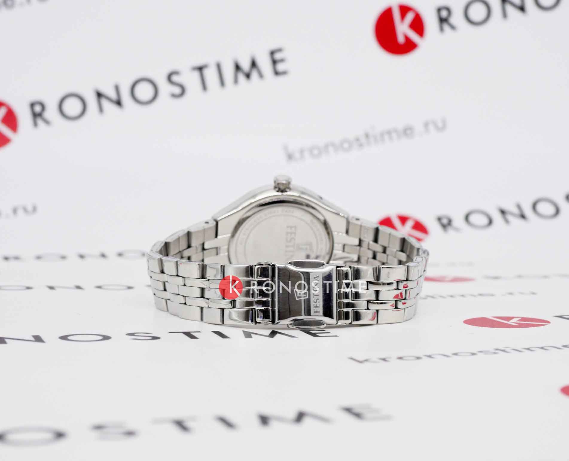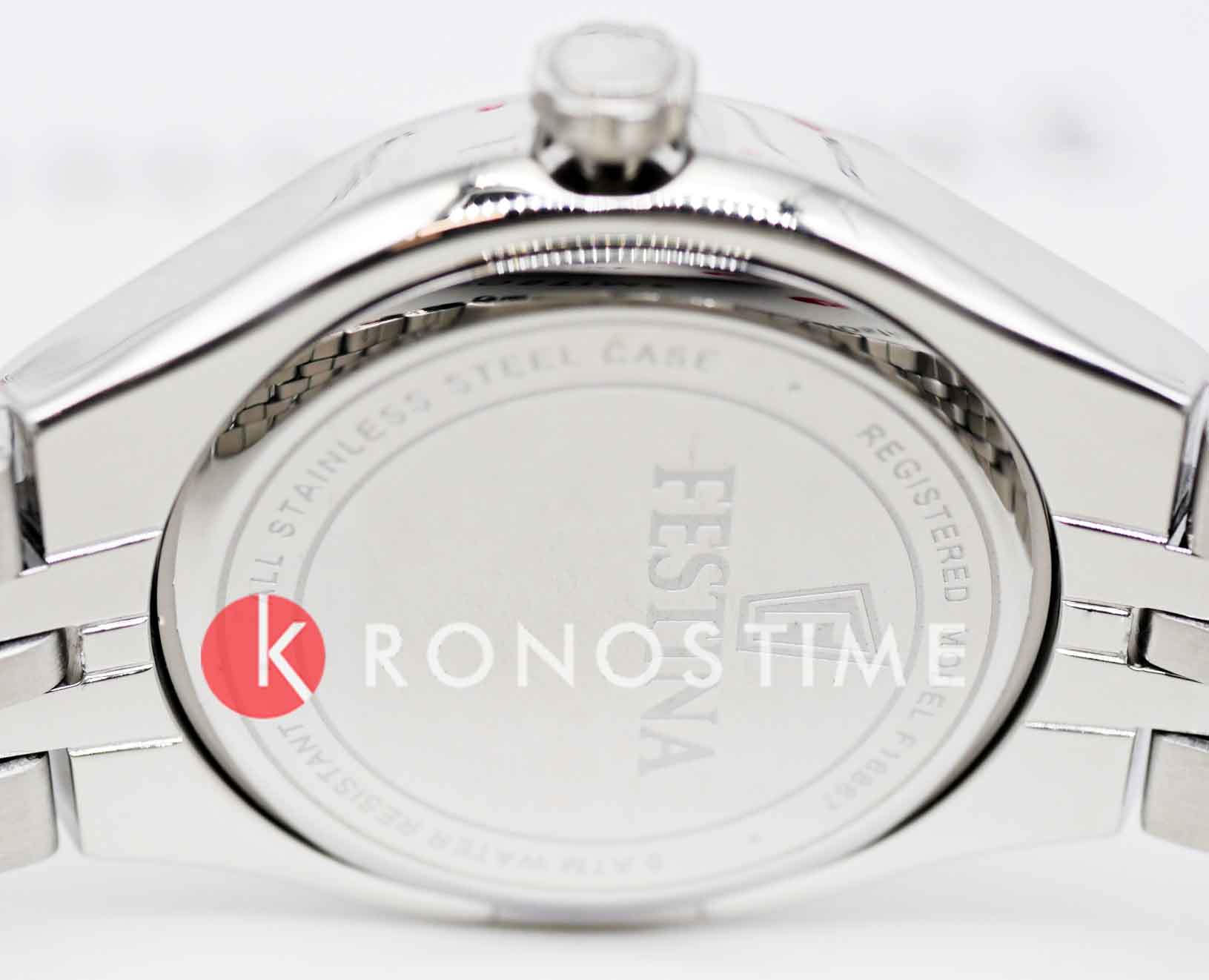 Женские часы Festina F16867/5. Корпус часов изготовлен из нержавеющей стали. Минеральное стеклоМинеральное стеклоМинеральное стекло представляет собой искусственно выращенный минерал кварца. Такое стекло отличается особой устойчивостью к повреждениям и царапинам. Уступает по некоторым качествам сапфировому стеклу. устойчивое к мелким механическим повреждениям. Класс водозащиты: 50 метров, позволит защитить корпус от случайных брызг или капель дождя. Стальной браслет на раскладной застёжкеРаскладная застёжкаТакой тип застёжки используется только на браслетах из металла. Она никогда не раскрывается полностью, происходит разделение на 2 и более частей. Раскладывающая застёжка снизит вероятность потери часов к минимуму.. Неподвижный стальной безельБезельВнешний ободок, закрепляющий стекло. В спортивных часах так называется поворотное кольцо с делениями на циферблате, выполняет роль таймера – замеряет отрезки времени на шкале. Неподвижный безель – элемент декора. Однонаправленно вращающийся безель на дайверских часах позволяет фиксировать моменты погружения и выныривания на поверхность. с фианитами.