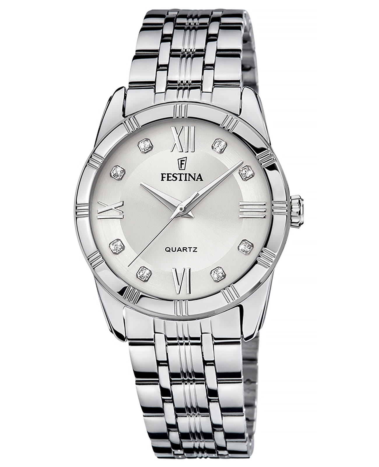 Festina Mademoiselle F16940/A - яркий стиль и функциональность этих часов придутся по душе активной девушке. Кварцевый механизм с высокой точностью. Минеральное стеклоМинеральное стеклоМинеральное стекло представляет собой искусственно выращенный минерал кварца. Такое стекло отличается особой устойчивостью к повреждениям и царапинам. Уступает по некоторым качествам сапфировому стеклу. устойчивое к появлению царапин, обладающее высокой прозрачностью. Изящный корпус диаметром 32 мм из нержавеющей стали 316L серебристого цвета идеально сочетается с серебристым циферблатом, придающими часам неповторимый блеск. Стальной браслет на раскладной застёжкеРаскладная застёжкаТакой тип застёжки используется только на браслетах из металла. Она никогда не раскрывается полностью, происходит разделение на 2 и более частей. Раскладывающая застёжка снизит вероятность потери часов к минимуму. обеспечивает комфортное ношение. Метки в виде точек (цирконы) и римских цифр. Рифленая заводная головка. Класс водозащиты: 50 метров, позволит защитить корпус от случайных брызг или капель дождя. Это идеальный аксессуар для современной женщины, ценящей элегантность и функциональность.