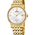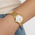 Наручные женские часы с окошком даты, кварцевый механизм с высокой точностью. Метки в виде арабских цифр. Окошко даты находится в положении 3 часа. Класс водозащиты: 50 метров, позволит защитить часы от случайных брызг воды. Циферблат защищен сапфировым стекломСапфировое стеклоПрочный и надёжный материал из кристалла сапфира синтетического происхождения, характеризующийся особой твёрдостью и устойчивостью к царапинам и повреждениям., устойчивым к появлению царапин и обладающим высокой прозрачностью. Часы на классической раскладной застёжкеРаскладная застёжкаТакой тип застёжки используется только на браслетах из металла. Она никогда не раскрывается полностью, происходит разделение на 2 и более частей. Раскладывающая застёжка снизит вероятность потери часов к минимуму.. Корпус и браслет с PVD-покрытиемPVDУльтратонкое покрытие наносится в технике вакуумного напыления, сочетает в себе нитрид титана особой прочности со слоем золота или оксида хрома. Несёт в себе декоративную или защитную функцию..