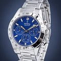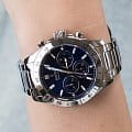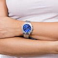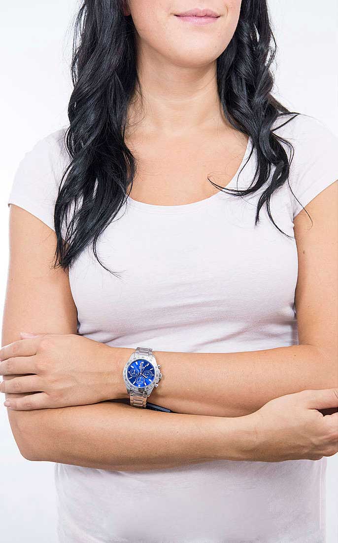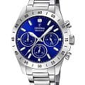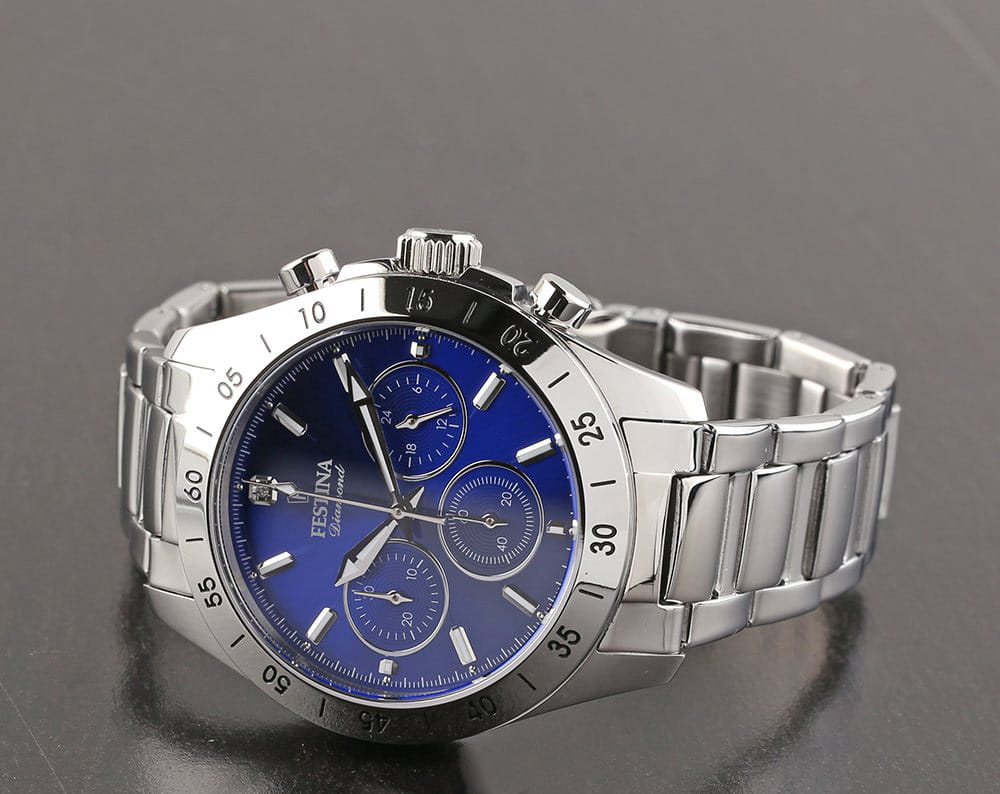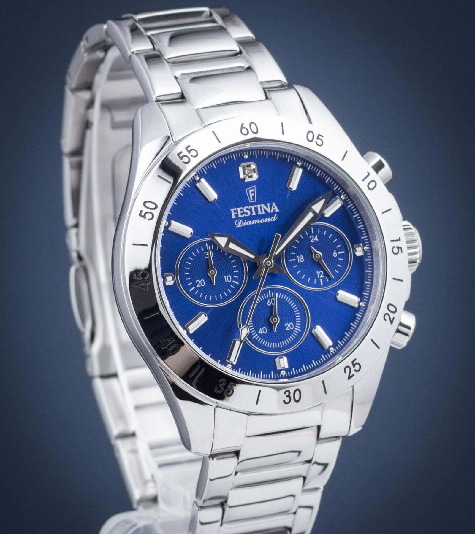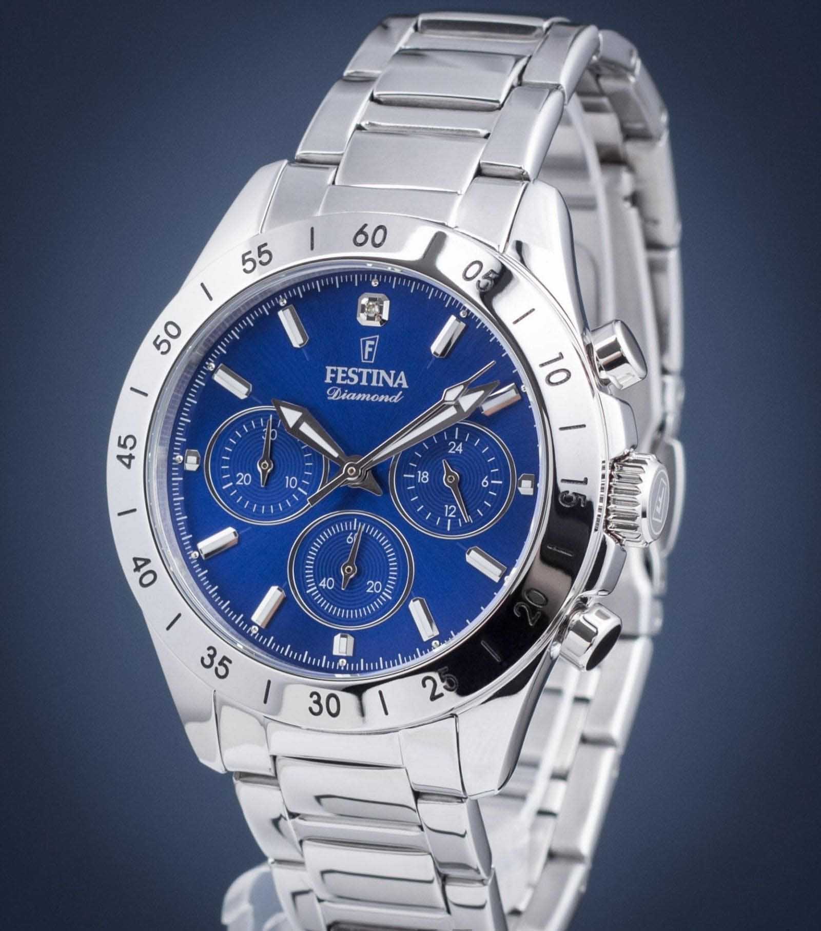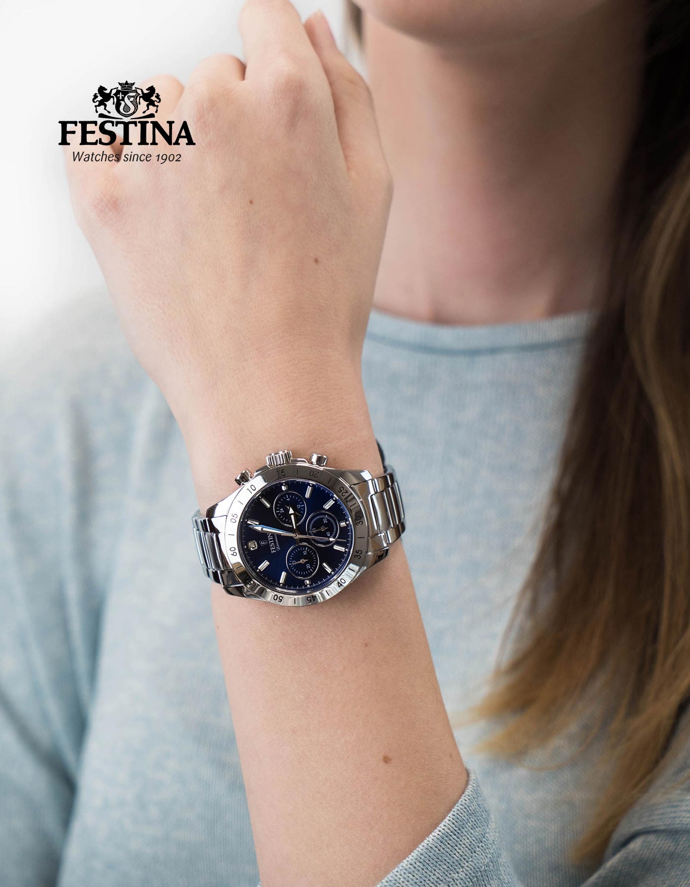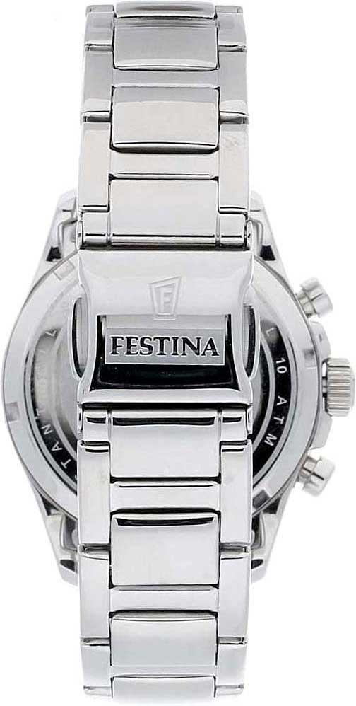 Женские кварцевые часы-хронографХронографФункция позволяет измерять отрезки времени с особой точностью: часы, минуты, секунды. Верным признаком хронографа является наличие на циферблате 3 дополнительных окошек-счётчиков. с секундомеромСекундомерСекундоме́р — прибор, способный измерять интервалы времени с точностью до долей секунды. Festina Boyfriend F20397/2, кварцевый механизм с высокой точностью. Минеральное стеклоМинеральное стеклоМинеральное стекло представляет собой искусственно выращенный минерал кварца. Такое стекло отличается особой устойчивостью к повреждениям и царапинам. Уступает по некоторым качествам сапфировому стеклу. устойчивое к мелким механическим повреждениям. Класс водозащиты: 100 метров, позволит плавать, нырять и заниматься другими водными видами спорта. Корпус часов изготовлен из стали. Стальной браслет на раскладной застёжкеРаскладная застёжкаТакой тип застёжки используется только на браслетах из металла. Она никогда не раскрывается полностью, происходит разделение на 2 и более частей. Раскладывающая застёжка снизит вероятность потери часов к минимуму.. Рифленая заводная головка с защитой. Стрелки и метки с люминесцентным покрытиемЛюминесцентное покрытиеПозволяет считывать показания времени в темноте. Производители наносят на стрелки, часовые индексы, безель или поверхность циферблата светонакопительный состав, дающий холодное свечение..