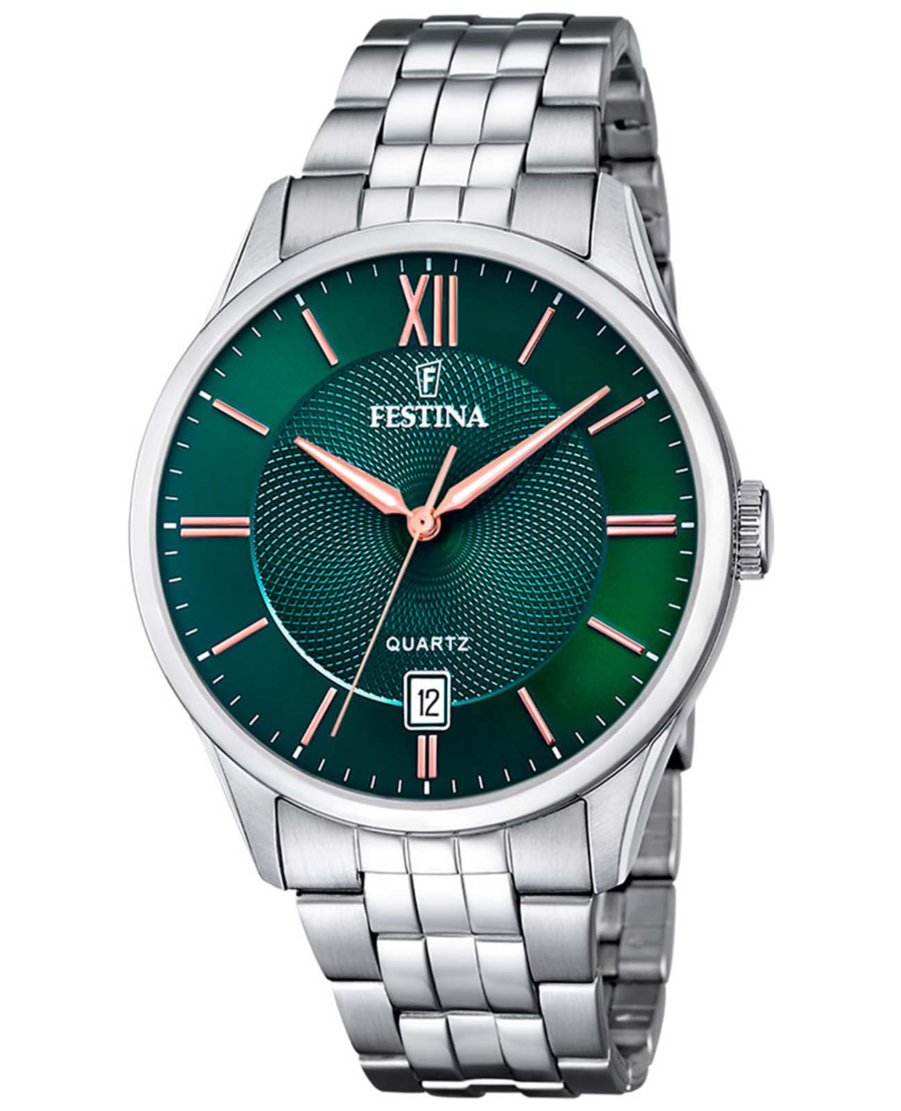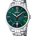 Наручные мужские часы с раскладывающейся застежкой Festina Classics F20425/7, кварцевый механизм с высокой точностью. Класс водозащиты: 50 метров, позволит защитить корпус от случайных брызг или капель дождя. Стрелки циферблата c люминесцентным покрытиемЛюминесцентное покрытиеПозволяет считывать показания времени в темноте. Производители наносят на стрелки, часовые индексы, безель или поверхность циферблата светонакопительный состав, дающий холодное свечение.. Корпус часов изготовлен из стали, серебристого цвета. Браслет с раскладной застёжкойРаскладная застёжкаТакой тип застёжки используется только на браслетах из металла. Она никогда не раскрывается полностью, происходит разделение на 2 и более частей. Раскладывающая застёжка снизит вероятность потери часов к минимуму..