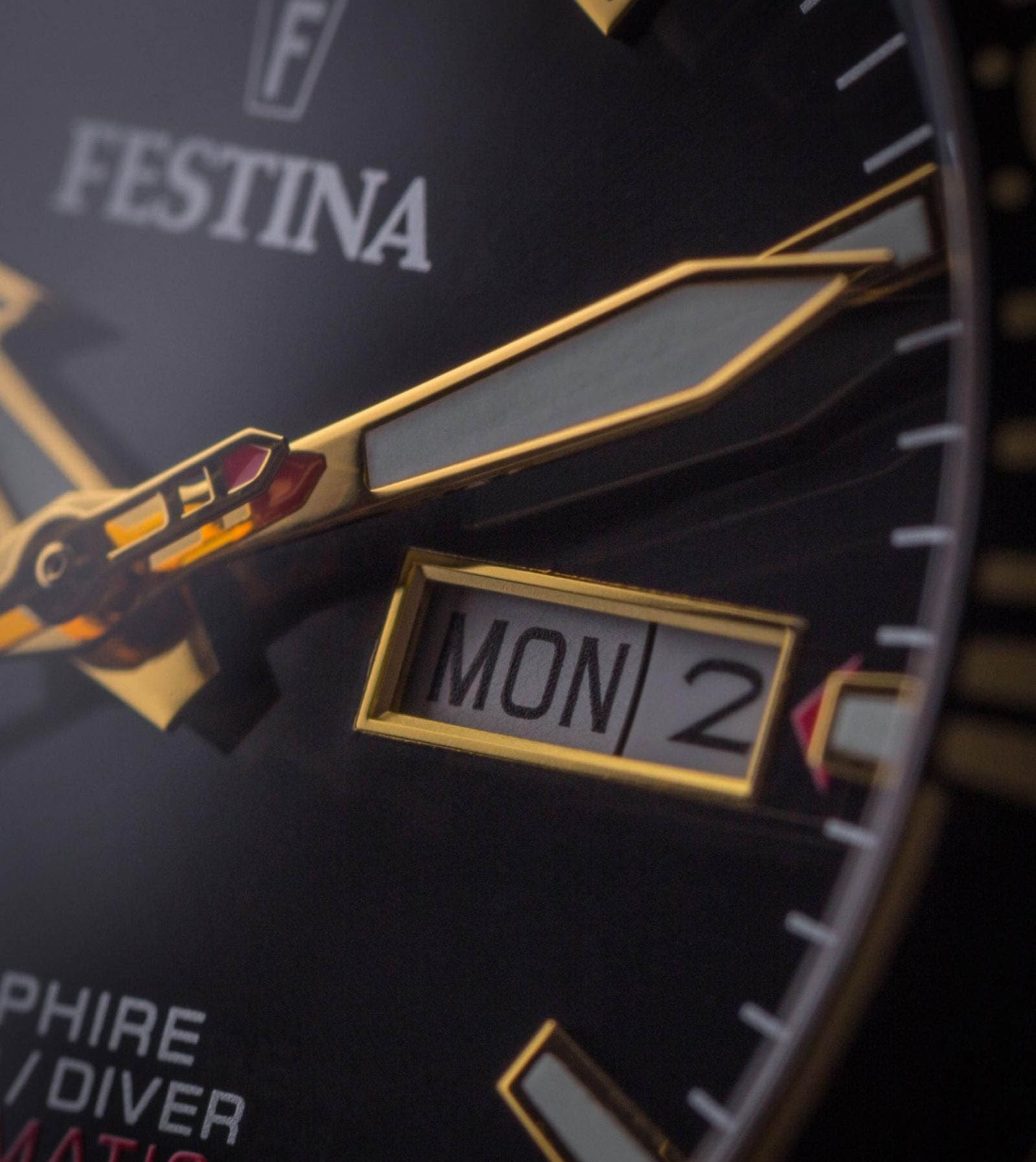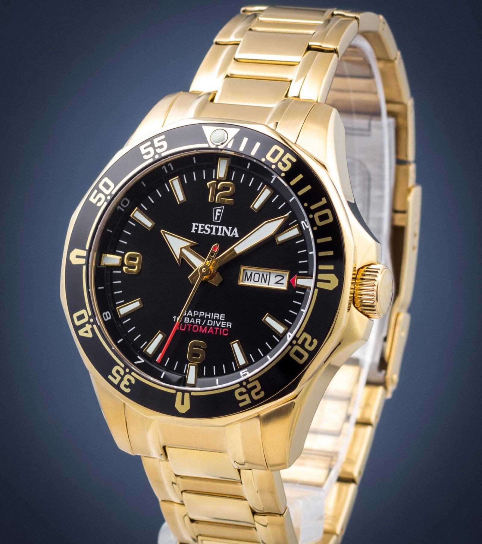 Мужские механические часы Festina Automatic F20479/4, механический механизм (автоматический калибр) с высокой точностью. Сапфировое стеклоСапфировое стеклоПрочный и надёжный материал из кристалла сапфира синтетического происхождения, характеризующийся особой твёрдостью и устойчивостью к царапинам и повреждениям. устойчивое к появлению царапин, обладающее высокой прозрачностью. Класс водозащиты: 100 метров, позволит плавать, нырять и заниматься другими водными видами спорта. Корпус часов изготовлен из стали с IP-покрытиемIP-покрытиеМетод ионного напыления. Демонстрирует повышенную устойчивость к истиранию, окислению и химическим веществам. Под воздействием высокого давления и температуры около 1500°C молекулы металла надёжно соединяются с частицами корпуса часов.. Стальной браслет на раскладной застёжкеРаскладная застёжкаТакой тип застёжки используется только на браслетах из металла. Она никогда не раскрывается полностью, происходит разделение на 2 и более частей. Раскладывающая застёжка снизит вероятность потери часов к минимуму. с IP-покрытиемIP-покрытиеМетод ионного напыления. Демонстрирует повышенную устойчивость к истиранию, окислению и химическим веществам. Под воздействием высокого давления и температуры около 1500°C молекулы металла надёжно соединяются с частицами корпуса часов.. Окошки дня недели и даты находятся в положении 3 часа. БезельБезельВнешний ободок, закрепляющий стекло. В спортивных часах так называется поворотное кольцо с делениями на циферблате, выполняет роль таймера – замеряет отрезки времени на шкале. Неподвижный безель – элемент декора. Однонаправленно вращающийся безель на дайверских часах позволяет фиксировать моменты погружения и выныривания на поверхность. с IP-покрытиемIP-покрытиеМетод ионного напыления. Демонстрирует повышенную устойчивость к истиранию, окислению и химическим веществам. Под воздействием высокого давления и температуры около 1500°C молекулы металла надёжно соединяются с частицами корпуса часов.. Стрелки и метки с люминесцентным покрытиемЛюминесцентное покрытиеПозволяет считывать показания времени в темноте. Производители наносят на стрелки, часовые индексы, безель или поверхность циферблата светонакопительный состав, дающий холодное свечение..