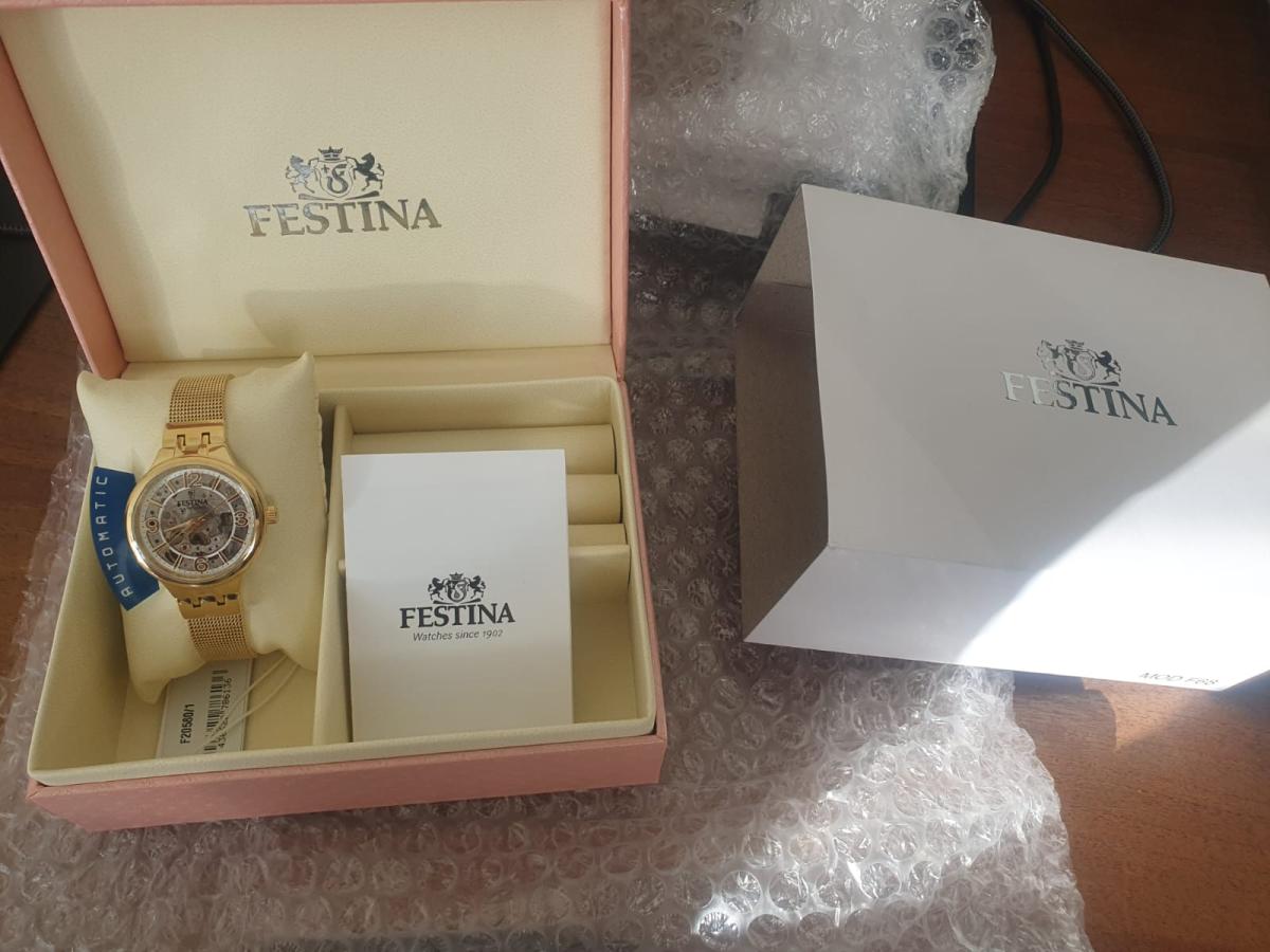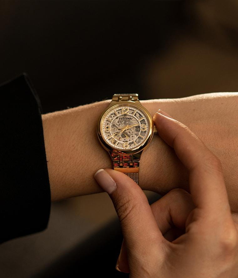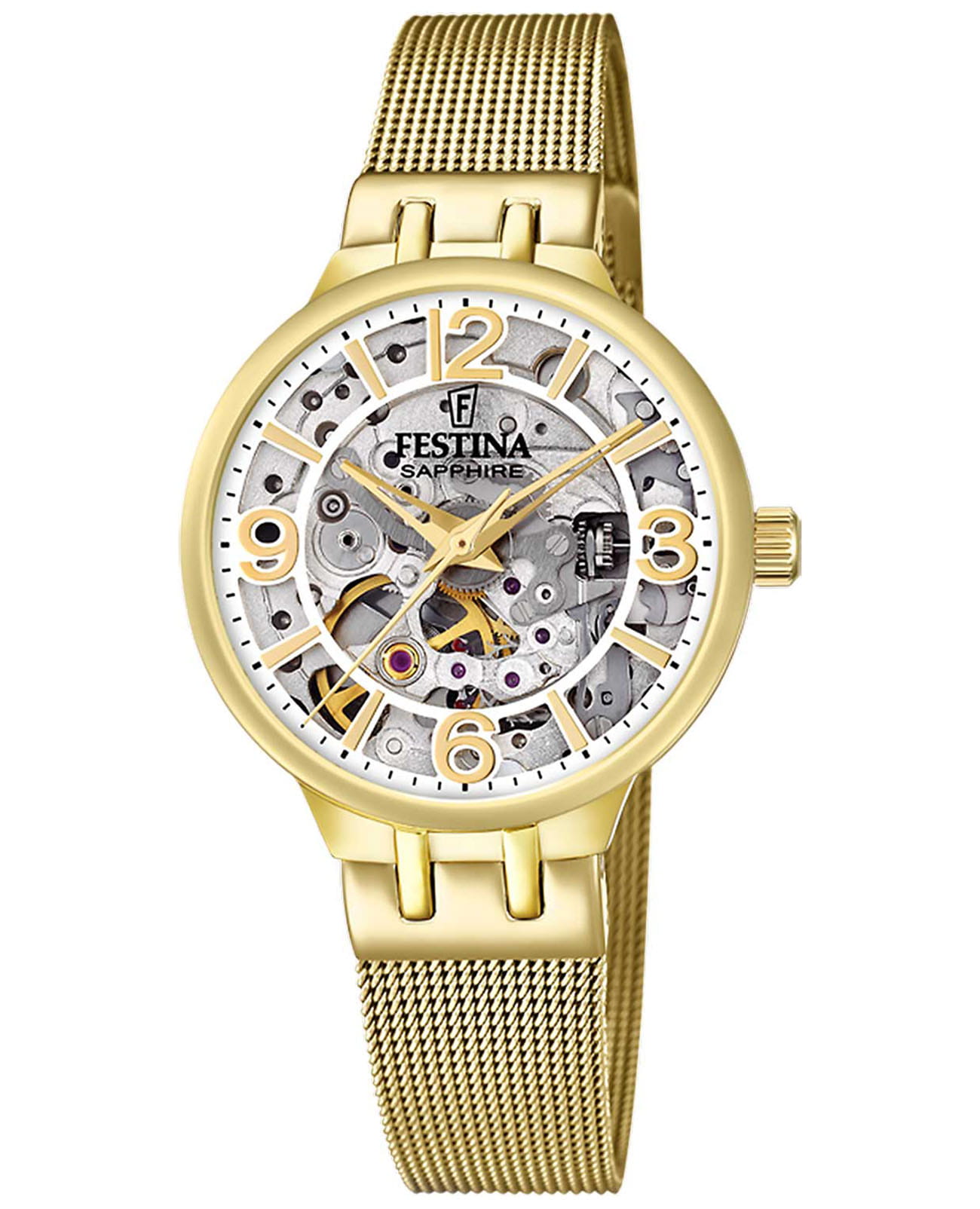 Женские механические часы-скелетоны Festina Automatic F20580/1, механический механизм (автоматический калибр) с высокой точностью. Сапфировое стеклоСапфировое стеклоПрочный и надёжный материал из кристалла сапфира синтетического происхождения, характеризующийся особой твёрдостью и устойчивостью к царапинам и повреждениям. устойчивое к появлению царапин, обладающее высокой прозрачностью. Класс водозащиты: 50 метров, позволит защитить корпус от случайных брызг или капель дождя. Корпус часов изготовлен из стали с PVD-покрытиемPVDУльтратонкое покрытие наносится в технике вакуумного напыления, сочетает в себе нитрид титана особой прочности со слоем золота или оксида хрома. Несёт в себе декоративную или защитную функцию.. Стальной миланского плетения браслет на раскладной застёжкеРаскладная застёжкаТакой тип застёжки используется только на браслетах из металла. Она никогда не раскрывается полностью, происходит разделение на 2 и более частей. Раскладывающая застёжка снизит вероятность потери часов к минимуму. с PVD-покрытиемPVDУльтратонкое покрытие наносится в технике вакуумного напыления, сочетает в себе нитрид титана особой прочности со слоем золота или оксида хрома. Несёт в себе декоративную или защитную функцию.. БезельБезельВнешний ободок, закрепляющий стекло. В спортивных часах так называется поворотное кольцо с делениями на циферблате, выполняет роль таймера – замеряет отрезки времени на шкале. Неподвижный безель – элемент декора. Однонаправленно вращающийся безель на дайверских часах позволяет фиксировать моменты погружения и выныривания на поверхность. с PVD-покрытиемPVDУльтратонкое покрытие наносится в технике вакуумного напыления, сочетает в себе нитрид титана особой прочности со слоем золота или оксида хрома. Несёт в себе декоративную или защитную функцию.. Циферблат с метками в виде штрихов и арабских цифр. Рифленая заводная головка.