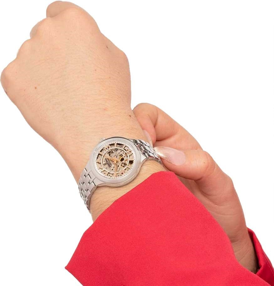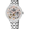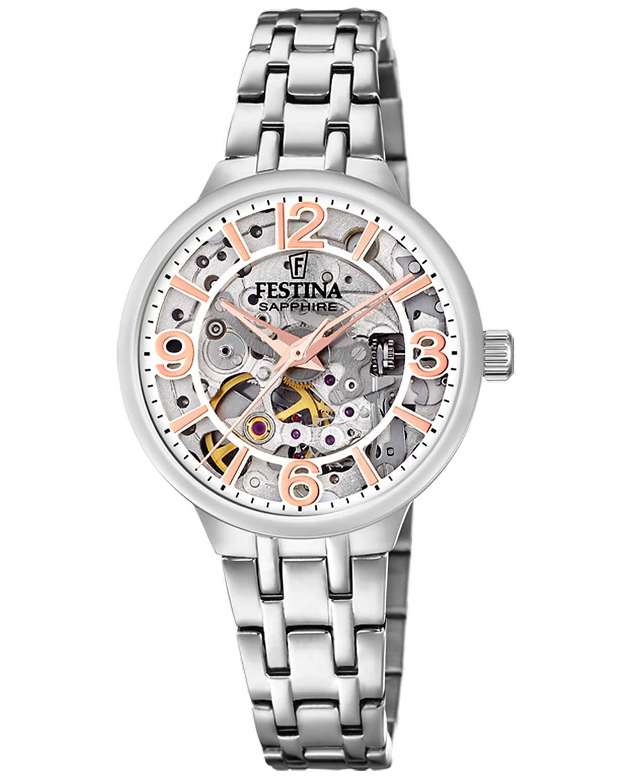 Женские механические часы-скелетоны Festina Automatic F20614/1, механический механизм (автоматический калибр) с высокой точностью. Сапфировое стеклоСапфировое стеклоПрочный и надёжный материал из кристалла сапфира синтетического происхождения, характеризующийся особой твёрдостью и устойчивостью к царапинам и повреждениям. устойчивое к появлению царапин, обладающее высокой прозрачностью. Класс водозащиты: 50 метров, позволит защитить корпус от случайных брызг или капель дождя. Корпус часов изготовлен из стали. Стальной браслет на раскладной застёжкеРаскладная застёжкаТакой тип застёжки используется только на браслетах из металла. Она никогда не раскрывается полностью, происходит разделение на 2 и более частей. Раскладывающая застёжка снизит вероятность потери часов к минимуму.. Циферблат с метками в виде штрихов и арабских цифр. Рифленая заводная головка.