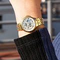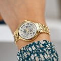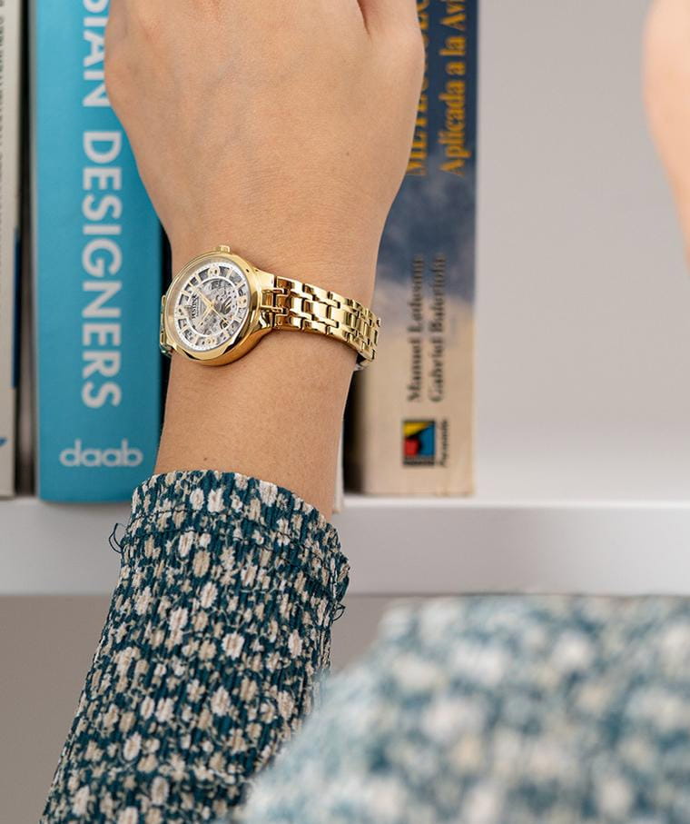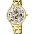 Женские механические часы-скелетоны Festina Automatic F20617/1, механический механизм (автоматический калибр) с высокой точностью. Сапфировое стеклоСапфировое стеклоПрочный и надёжный материал из кристалла сапфира синтетического происхождения, характеризующийся особой твёрдостью и устойчивостью к царапинам и повреждениям. устойчивое к появлению царапин, обладающее высокой прозрачностью. Класс водозащиты: 50 метров, позволит защитить корпус от случайных брызг или капель дождя. Корпус часов изготовлен из стали с PVD-покрытиемPVDУльтратонкое покрытие наносится в технике вакуумного напыления, сочетает в себе нитрид титана особой прочности со слоем золота или оксида хрома. Несёт в себе декоративную или защитную функцию.. Стальной браслет на раскладной застёжкеРаскладная застёжкаТакой тип застёжки используется только на браслетах из металла. Она никогда не раскрывается полностью, происходит разделение на 2 и более частей. Раскладывающая застёжка снизит вероятность потери часов к минимуму. с PVD-покрытиемPVDУльтратонкое покрытие наносится в технике вакуумного напыления, сочетает в себе нитрид титана особой прочности со слоем золота или оксида хрома. Несёт в себе декоративную или защитную функцию.. БезельБезельВнешний ободок, закрепляющий стекло. В спортивных часах так называется поворотное кольцо с делениями на циферблате, выполняет роль таймера – замеряет отрезки времени на шкале. Неподвижный безель – элемент декора. Однонаправленно вращающийся безель на дайверских часах позволяет фиксировать моменты погружения и выныривания на поверхность. с PVD-покрытиемPVDУльтратонкое покрытие наносится в технике вакуумного напыления, сочетает в себе нитрид титана особой прочности со слоем золота или оксида хрома. Несёт в себе декоративную или защитную функцию.. Циферблат с метками в виде штрихов и арабских цифр. Рифленая заводная головка.