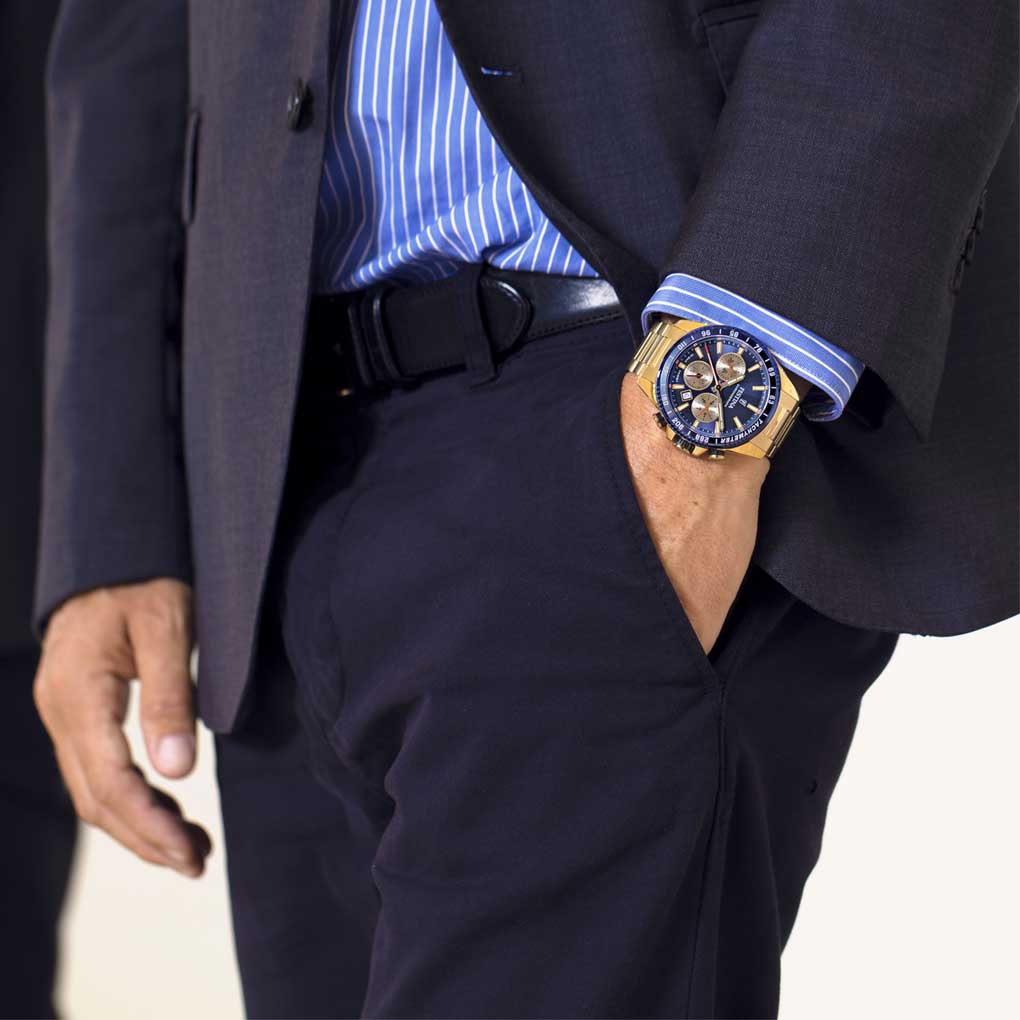 Эксклюзивный хронографХронографФункция позволяет измерять отрезки времени с особой точностью: часы, минуты, секунды. Верным признаком хронографа является наличие на циферблате 3 дополнительных окошек-счётчиков. с секундомеромСекундомерСекундоме́р — прибор, способный измерять интервалы времени с точностью до долей секунды. и тахиметромТахиметрРазмеченная шкала, располагается на ободке или безеле часов. Тахиметр позволяет рассчитать скорость на определённом участке пути, расстояние измеряется в километрах или милях., отличающийся продуманным дизайном и отделкой, придется по вкусу мужчинам, ценящим идеальное соотношение цены и качества. Минеральное стеклоМинеральное стеклоМинеральное стекло представляет собой искусственно выращенный минерал кварца. Такое стекло отличается особой устойчивостью к повреждениям и царапинам. Уступает по некоторым качествам сапфировому стеклу. устойчивое к появлению царапин, обладающее высокой прозрачностью. Циферблат с люминесцентным покрытиемЛюминесцентное покрытиеПозволяет считывать показания времени в темноте. Производители наносят на стрелки, часовые индексы, безель или поверхность циферблата светонакопительный состав, дающий холодное свечение. стрелок и меток. Корпус и браслет с PVDPVDУльтратонкое покрытие наносится в технике вакуумного напыления, сочетает в себе нитрид титана особой прочности со слоем золота или оксида хрома. Несёт в себе декоративную или защитную функцию. покрытием. Класс водозащиты: 100 метров, позволит защитить корпус от случайных брызг или капель дождя.