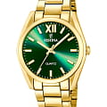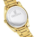 Наручные женские часы с минеральным стекломМинеральное стеклоМинеральное стекло представляет собой искусственно выращенный минерал кварца. Такое стекло отличается особой устойчивостью к повреждениям и царапинам. Уступает по некоторым качествам сапфировому стеклу. Festina Boyfriend F20640/9, кварцевый механизм с высокой точностью. Класс водозащиты: 50 метров, позволит защитить корпус от случайных брызг или капель дождя. Корпус часов изготовлен из стали с позолотой. Стальной браслет на раскладной застёжкеРаскладная застёжкаТакой тип застёжки используется только на браслетах из металла. Она никогда не раскрывается полностью, происходит разделение на 2 и более частей. Раскладывающая застёжка снизит вероятность потери часов к минимуму.. Стрелки и метки с люминесцентным покрытиемЛюминесцентное покрытиеПозволяет считывать показания времени в темноте. Производители наносят на стрелки, часовые индексы, безель или поверхность циферблата светонакопительный состав, дающий холодное свечение..