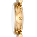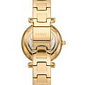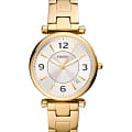 Женские американские часы  с минеральным стекломМинеральное стеклоМинеральное стекло представляет собой искусственно выращенный минерал кварца. Такое стекло отличается особой устойчивостью к повреждениям и царапинам. Уступает по некоторым качествам сапфировому стеклу. Fossil Carlie ES5159, кварцевый механизм с высокой точностью. Корпус и браслет часов изготовлены из нержавеющей стали  с IP-покрытиемIP-покрытиеМетод ионного напыления. Демонстрирует повышенную устойчивость к истиранию, окислению и химическим веществам. Под воздействием высокого давления и температуры около 1500°C молекулы металла надёжно соединяются с частицами корпуса часов.. Метки в виде арабских цифр и штрихов. Окошко даты на 4,5 часа. Стрелки с люминесцентным покрытиемЛюминесцентное покрытиеПозволяет считывать показания времени в темноте. Производители наносят на стрелки, часовые индексы, безель или поверхность циферблата светонакопительный состав, дающий холодное свечение.. Рифленая заводная головка с защитой. Класс водозащиты: 50 метров, позволит защитить корпус от случайных брызг или капель дождя. Стальной браслет на раскладной застёжкеРаскладная застёжкаТакой тип застёжки используется только на браслетах из металла. Она никогда не раскрывается полностью, происходит разделение на 2 и более частей. Раскладывающая застёжка снизит вероятность потери часов к минимуму..
