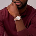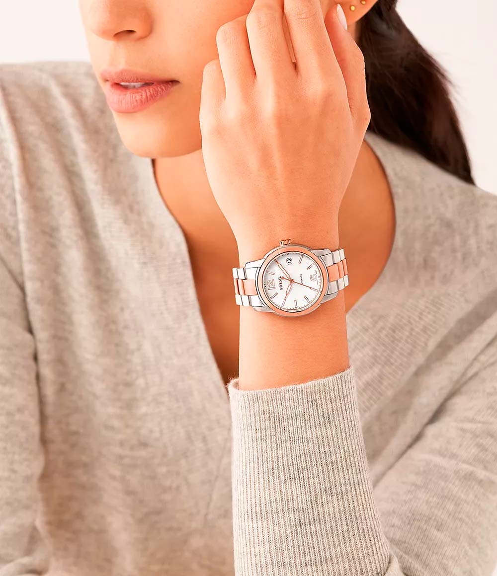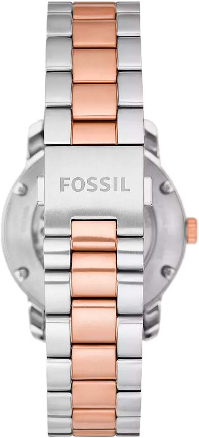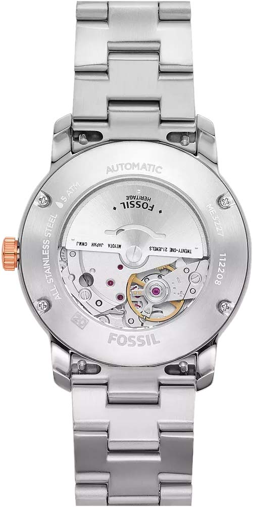 Наручные часы Fossil Heritage ME3227 с надёжным автоматическим механизмом. Корпус и браслет часов изготовлены из нержавеющей стали с частичным IP-покрытиемIP-покрытиеМетод ионного напыления. Демонстрирует повышенную устойчивость к истиранию, окислению и химическим веществам. Под воздействием высокого давления и температуры около 1500°C молекулы металла надёжно соединяются с частицами корпуса часов.. Минеральное стеклоМинеральное стеклоМинеральное стекло представляет собой искусственно выращенный минерал кварца. Такое стекло отличается особой устойчивостью к повреждениям и царапинам. Уступает по некоторым качествам сапфировому стеклу. устойчивое к мелким механическим повреждениям. Стальной браслет на раскладной застёжкеРаскладная застёжкаТакой тип застёжки используется только на браслетах из металла. Она никогда не раскрывается полностью, происходит разделение на 2 и более частей. Раскладывающая застёжка снизит вероятность потери часов к минимуму.. Класс водозащиты: 50 метров, позволит защитить корпус от случайных брызг или капель дождя. Стрелки и метки с люминесцентным покрытиемЛюминесцентное покрытиеПозволяет считывать показания времени в темноте. Производители наносят на стрелки, часовые индексы, безель или поверхность циферблата светонакопительный состав, дающий холодное свечение.. Окошко даты находится в положении 3 часа.
