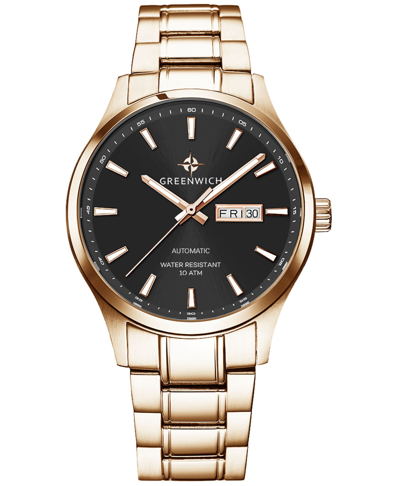 Мужские часы Greenwich Good Luck GW 054.40.31, механический механизм (автоматический калибр) с высокой точностью. Классический круглый стальной корпус с PVD-покрытиемPVDУльтратонкое покрытие наносится в технике вакуумного напыления, сочетает в себе нитрид титана особой прочности со слоем золота или оксида хрома. Несёт в себе декоративную или защитную функцию., защищенный минеральным стекломМинеральное стеклоМинеральное стекло представляет собой искусственно выращенный минерал кварца. Такое стекло отличается особой устойчивостью к повреждениям и царапинам. Уступает по некоторым качествам сапфировому стеклу.. Стрелки и метки с люминесцентным покрытиемЛюминесцентное покрытиеПозволяет считывать показания времени в темноте. Производители наносят на стрелки, часовые индексы, безель или поверхность циферблата светонакопительный состав, дающий холодное свечение.. Стальной браслет с PVD-покрытиемPVDУльтратонкое покрытие наносится в технике вакуумного напыления, сочетает в себе нитрид титана особой прочности со слоем золота или оксида хрома. Несёт в себе декоративную или защитную функцию. на раскладной застёжкеРаскладная застёжкаТакой тип застёжки используется только на браслетах из металла. Она никогда не раскрывается полностью, происходит разделение на 2 и более частей. Раскладывающая застёжка снизит вероятность потери часов к минимуму.. Класс водозащиты: 100 метров, позволит плавать, нырять и заниматься другими водными видами спорта. Окошко даты и дня недели находится в положении 3 часа.