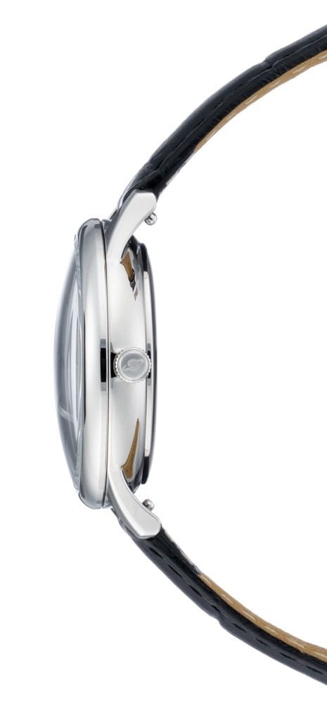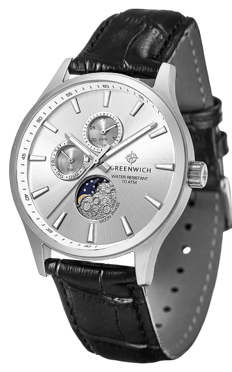 Мужские английские часы Greenwich Moon Walker GW 058.11.33 с минеральным стекломМинеральное стеклоМинеральное стекло представляет собой искусственно выращенный минерал кварца. Такое стекло отличается особой устойчивостью к повреждениям и царапинам. Уступает по некоторым качествам сапфировому стеклу.. В часах привлекает сочетание спортивного дизайна и классических линий корпуса из нержавеющей стали. Кварцевый механизм показывает время с точностью до секунды, дату, день недели. Все индикаторы на черном циферблате хорошо читаются, они выделены накладными рамками с зеркальной полировкой. В позиции «6 часов» расположен индикатор лунных фаз. Его украшением служит элемент с объемным рисунком, напоминающем изрытую кратерами поверхность спутника нашей планеты. Крупные стрелки и риски видны при любых условиях благодаря люминесцентному покрытию, которое в темноте светится приятным для глаз зеленоватым свечением. Повышенная водостойкость равна 10 атмосфер.