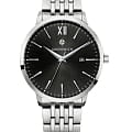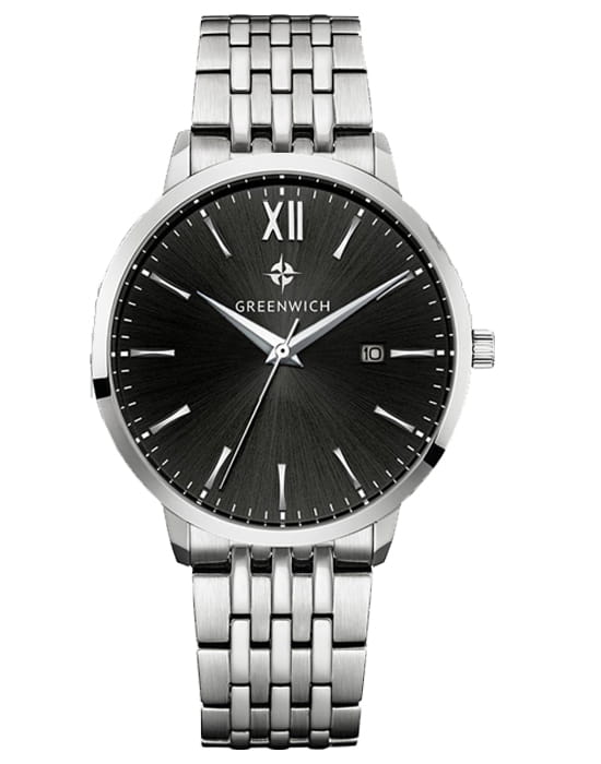 Классические мужские часы серии Brig прекрасно подойдут как под костюм, так и под одежду направления casual. В часах установлен точный японский механизм Miyota. Корпус часов изготовлен из нержавеющей гипоаллергенной стали: он изящно смотрится на руке и не создает неудобств при контакте с одеждой с длинным рукавом. Размер корпуса 41 мм. Полировка на циферблате черного цвета выполнена в виде солнечных лучей. Индексы часов изготовлены вручную и закреплены на двух штифтах. Выпуклая форма рисок создает эффект игры солнечных бликов. Объемные часовая и минутная стрелки имеют мечеобразную форму. В модели представлена дополнительная функция – дата. Ее окошко расположено на уровне трех часов. Циферблат надежно защищен минеральным стекломМинеральное стеклоМинеральное стекло представляет собой искусственно выращенный минерал кварца. Такое стекло отличается особой устойчивостью к повреждениям и царапинам. Уступает по некоторым качествам сапфировому стеклу.. На часах установлен браслет из стальных звеньев с надежной застежкой-клипсой. Логотип марки – изображение «розы ветров», символа удачи и новых открытий – расположен на циферблате, заводной головке и внутренней части ремешка. Задняя крышка часов украшена изображениями логотипа и корабля, который является символом марки Greenwich.