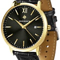 Мужские английские часы Greenwich GW 061.20.11 с минеральным стекломМинеральное стеклоМинеральное стекло представляет собой искусственно выращенный минерал кварца. Такое стекло отличается особой устойчивостью к повреждениям и царапинам. Уступает по некоторым качествам сапфировому стеклу.. Классические мужские часы серии Brig прекрасно подойдут как под костюм, так и под одежду направления casual. В часах установлен точный японский механизм Miyota. Корпус часов изготовлен из нержавеющей гипоаллергенной стали с PVDPVDУльтратонкое покрытие наносится в технике вакуумного напыления, сочетает в себе нитрид титана особой прочности со слоем золота или оксида хрома. Несёт в себе декоративную или защитную функцию. покрытием из желтого золота: он элегантно смотрится на руке и не создает неудобств при контакте с одеждой с длинным рукавом. Размер корпуса 41 мм. Полировка на циферблате черного цвета выполнена в виде солнечных лучей. Индексы часов изготовлены вручную и закреплены на двух штифтах. Выпуклая форма рисок создает эффект игры солнечных бликов. Объемные часовая и минутная стрелки имеют мечеобразную форму. В модели представлена дополнительная функция – дата. Ее окошко расположено на уровне трех часов. Циферблат надежно защищен минеральным стеклом. На часах установлен черный ремешок из натуральной кожи. Логотип марки – изображение «розы ветров», символа удачи и новых открытий – расположен на циферблате, заводной головке и внутренней части ремешка. Задняя крышка часов украшена изображениями логотипа и корабля, который является символом марки Greenwich.