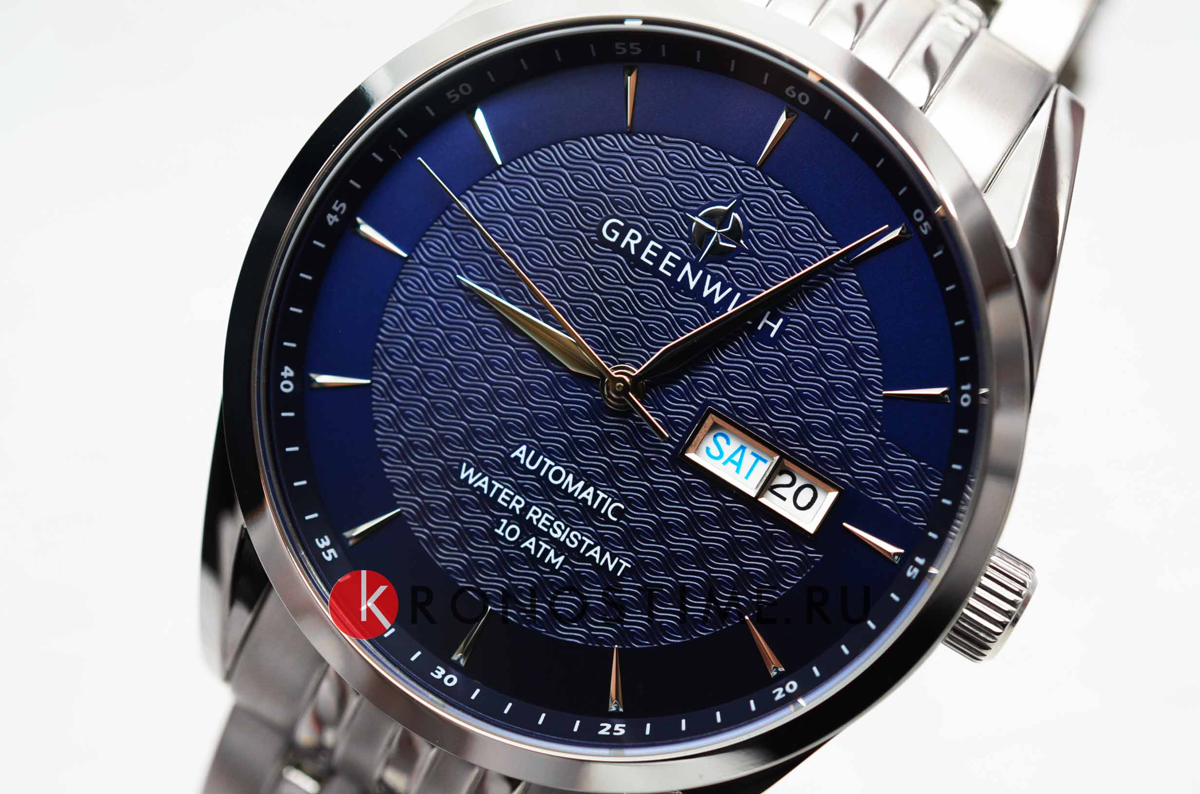 Мужские часы с минеральным стекломМинеральное стеклоМинеральное стекло представляет собой искусственно выращенный минерал кварца. Такое стекло отличается особой устойчивостью к повреждениям и царапинам. Уступает по некоторым качествам сапфировому стеклу. Greenwich Good Luck Classic GW 074.10.36, представляют собой классический вариант для повседневной носки. В центральной части циферблата — отличительная черта моделей этой серии: гильоше, объемные линии которого напоминают волны. Обратите внимание на форму пластины, где крепятся накладные риски: она сделана в форме латинской буквы G, первой буквы в названии бренда. Часы характеризуются традиционными формами, лаконичным исполнением, что делает модель элегантным дополнением к деловому костюму. Сквозь прозрачную заднюю крышку вы увидите детали механизма TMI с декорированным ротором: на нем выгравировано изображение символа английских моряков — парусника. Браслет и застежка-клипса выполнены из гипоаллергенной нержавеющей стали. Дизайн, актуальный для любого современного образа, и надежность используемых материалов делают автоматические часы Greenwich удобным и стильным аксессуаром на каждый день.
