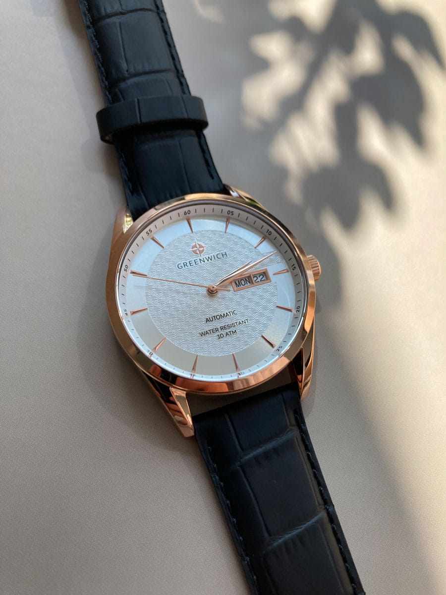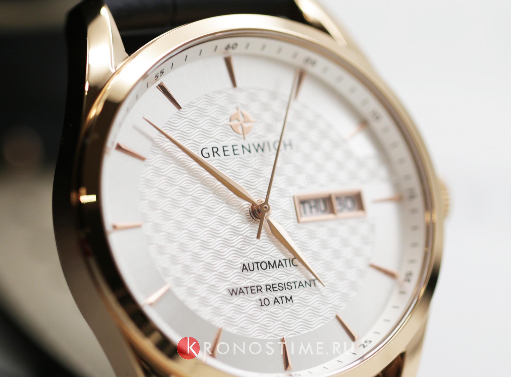 Мужские часы с минеральным стекломМинеральное стеклоМинеральное стекло представляет собой искусственно выращенный минерал кварца. Такое стекло отличается особой устойчивостью к повреждениям и царапинам. Уступает по некоторым качествам сапфировому стеклу. Greenwich Good Luck Classic GW 074.41.33, представляют собой классический вариант для повседневной носки. В центральной части циферблата — отличительная черта моделей этой серии: гильоше, объемные линии которого напоминают волны. Обратите внимание на форму пластины, где крепятся накладные риски: она сделана в форме латинской буквы G, первой буквы в названии бренда. Часы характеризуются традиционными формами, лаконичным исполнением, что делает модель элегантным дополнением к деловому костюму. Сквозь прозрачную заднюю крышку вы увидите детали механизма TMI с декорированным ротором: на нем выгравировано изображение символа английских моряков — парусника. Ремешок на стандартной застёжке выполнен из натуральной кожи с прошивкой в тон. Дизайн, актуальный для любого современного образа, и надежность используемых материалов делают автоматические часы Greenwich удобным и стильным аксессуаром на каждый день. Окошко даты и дня недели находится в положении 3 часа. Класс водозащиты: 100 метров, позволит плавать, нырять и заниматься другими водными видами спорта. Корпус с PVD-покрытиемPVDУльтратонкое покрытие наносится в технике вакуумного напыления, сочетает в себе нитрид титана особой прочности со слоем золота или оксида хрома. Несёт в себе декоративную или защитную функцию..