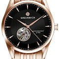 Водозащита до 10 ATM (100 метров) делает часы подходящими для плавания и других водных активностей. Литой браслет из нержавеющей стали с PVD-покрытиемPVDУльтратонкое покрытие наносится в технике вакуумного напыления, сочетает в себе нитрид титана особой прочности со слоем золота или оксида хрома. Несёт в себе декоративную или защитную функцию. розового золота оснащён застёжкой-клипсой с логотипом Greenwich, обеспечивающей комфортное ношение и надёжную фиксацию.